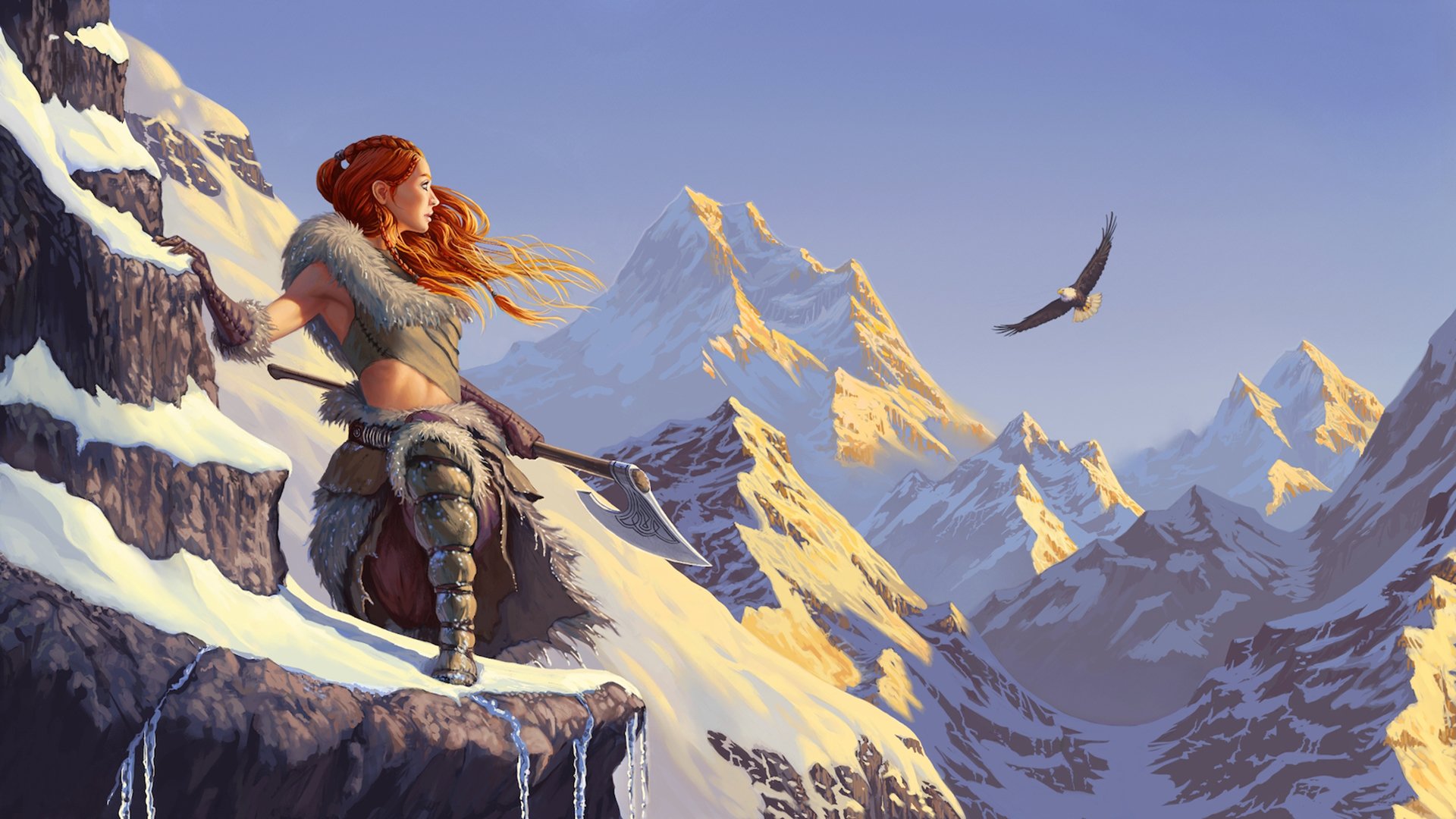 Fille Rousse avec une hache dans les montagnes enneigées