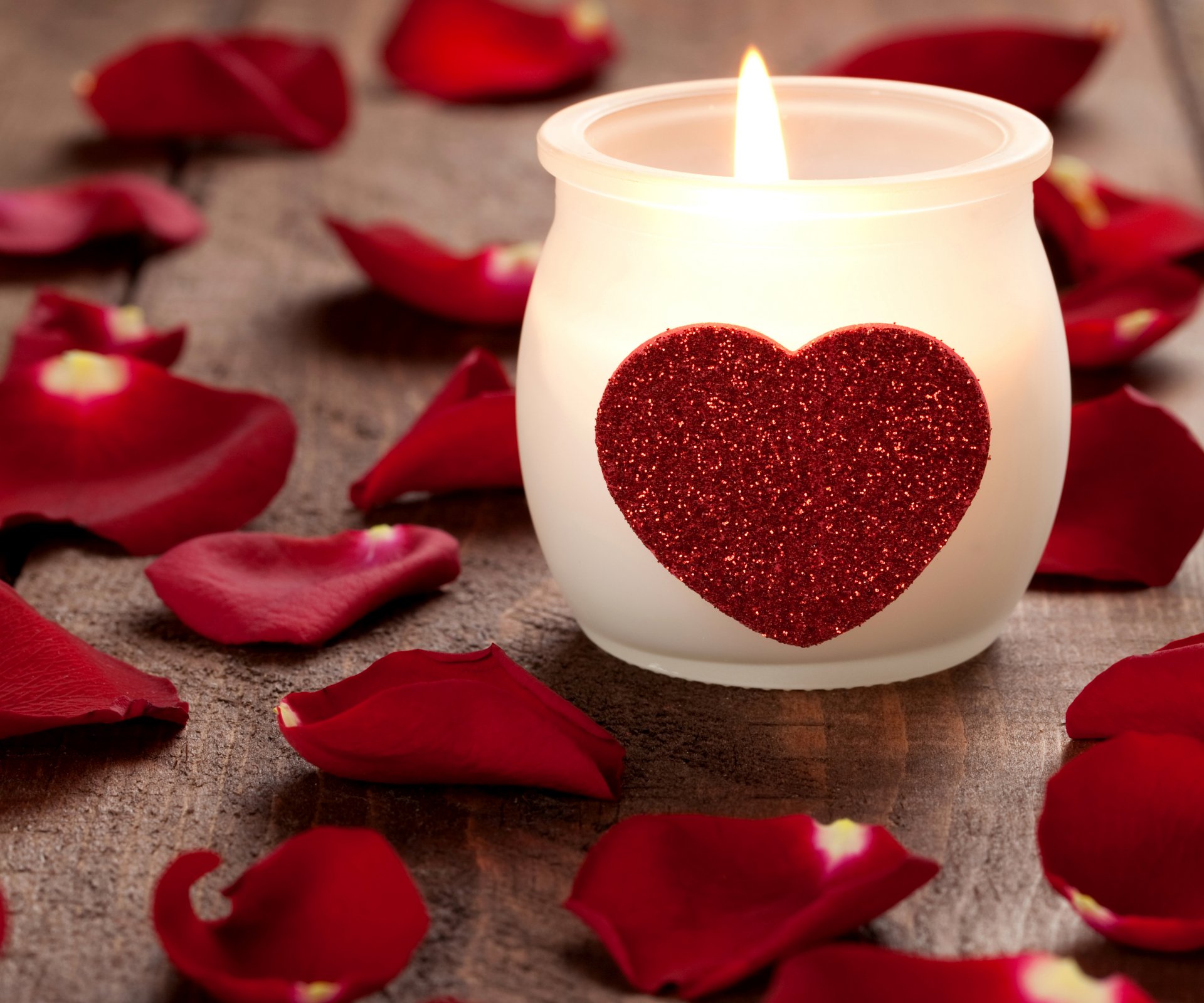 Bougie avec coeur parmi les pétales de rose