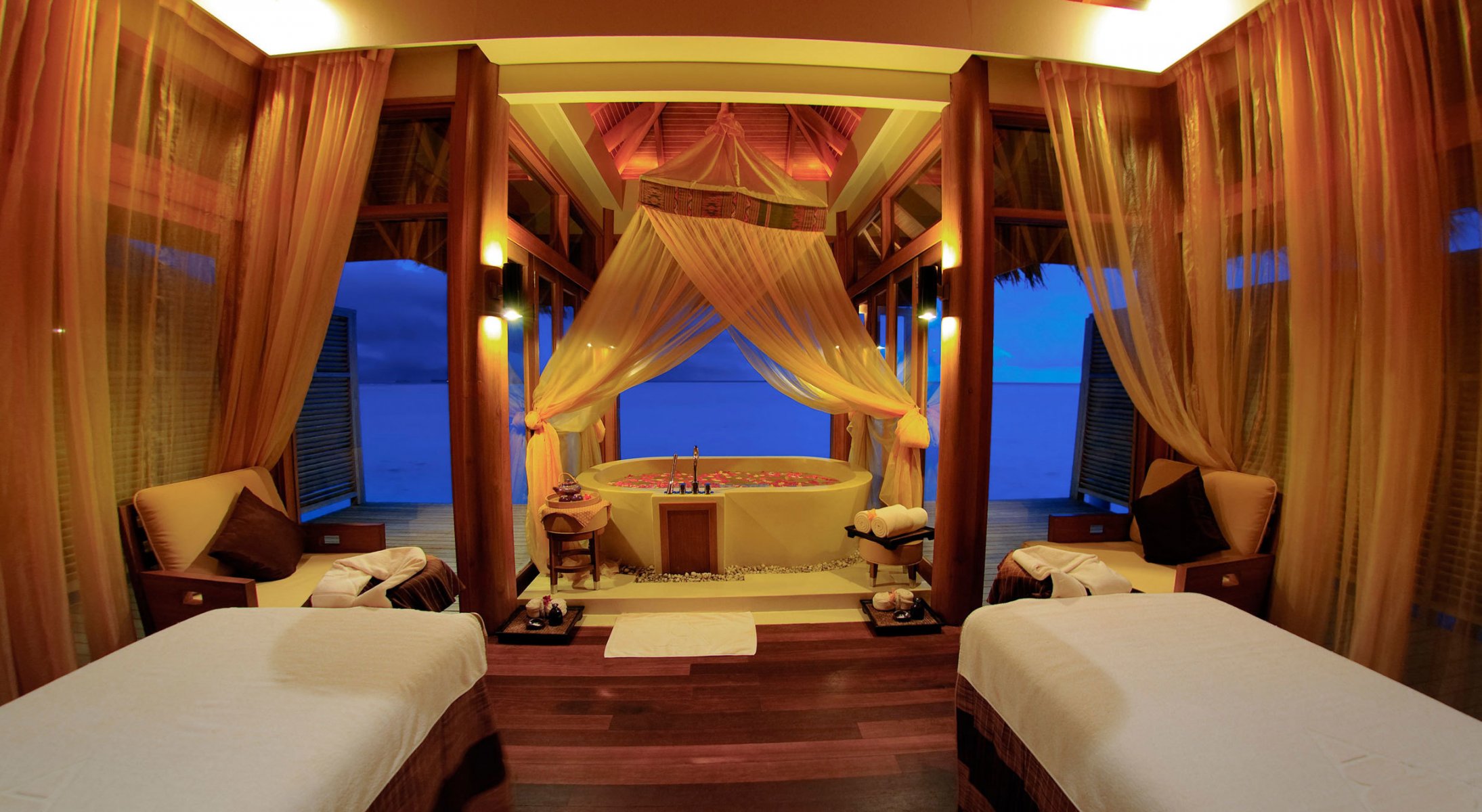 Salle de massage confortable avec baignoire relaxante avec pétales de roseSalle de massage confortable avec baignoire relaxante avec pétales de rose