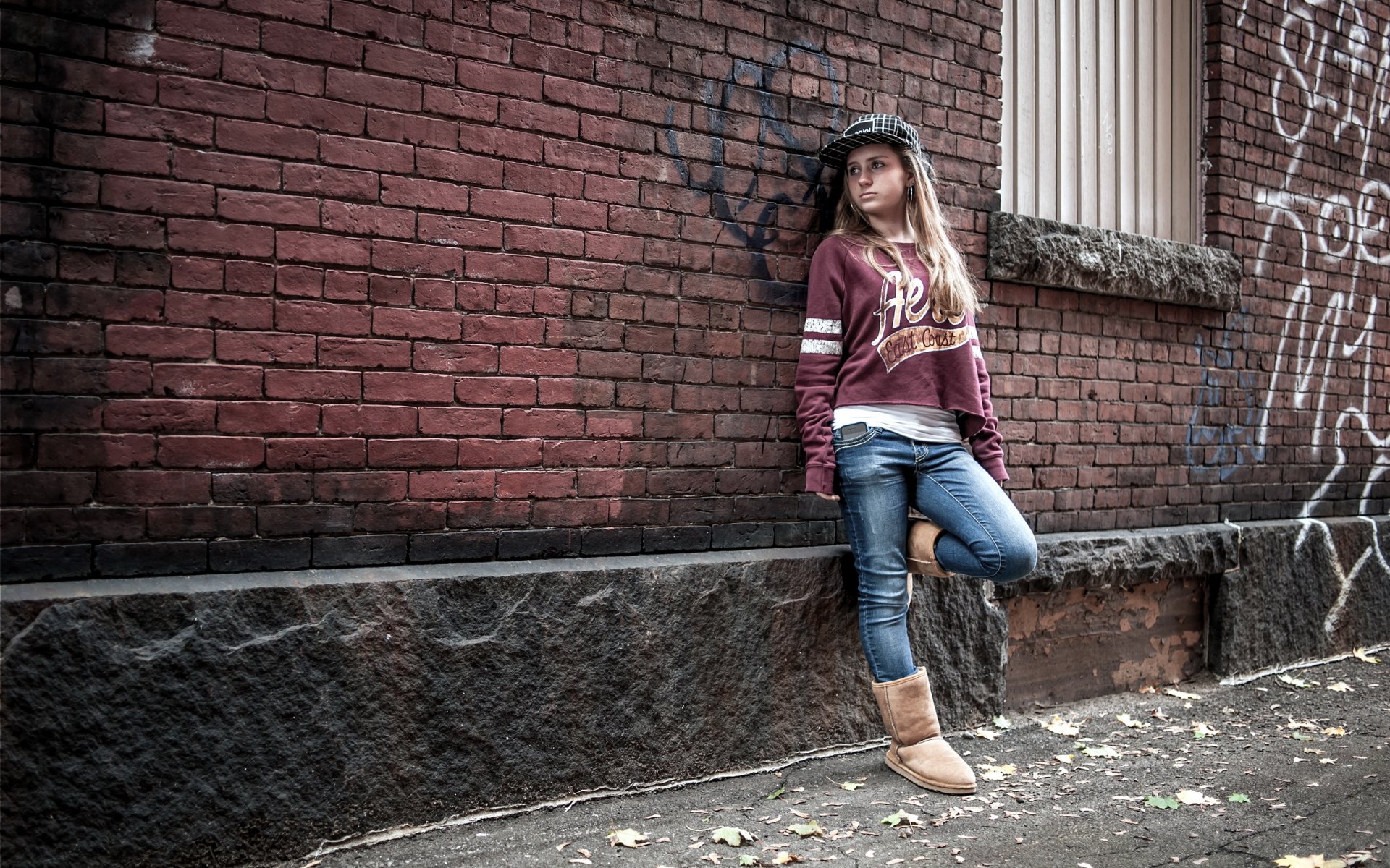 Bmw bleu se trouve sur la route près d'un mur de briques