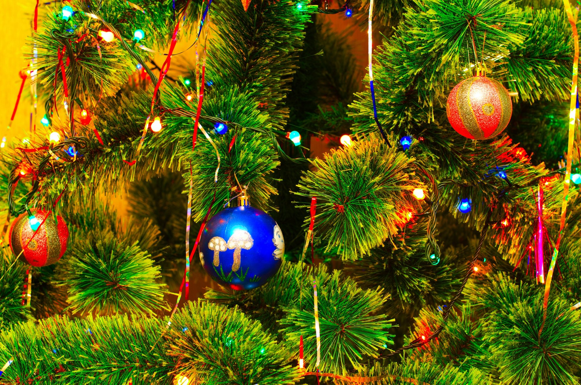 Sapin décoré du nouvel an près d'une cheminée en feu avec une Couronne de Noël et des ornements d'épinette suspendus au-dessus