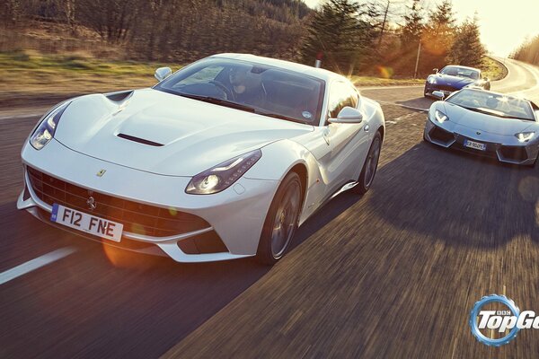 Blanc königsegg agera se précipite sur une route enneigée dans les montagnesBlanc königsegg Agera se précipite sur une route enneigée dans les montagnes