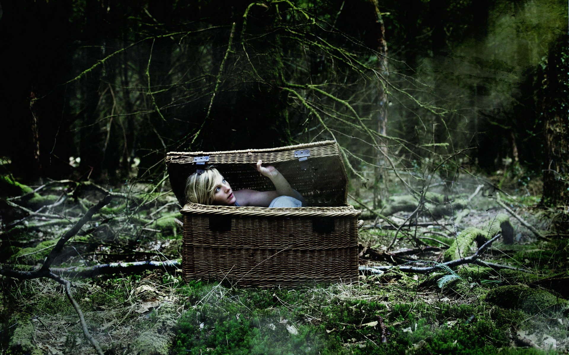 Fille dans un panier dans la situation de la forêtFille dans un panier dans la situation de la forêt