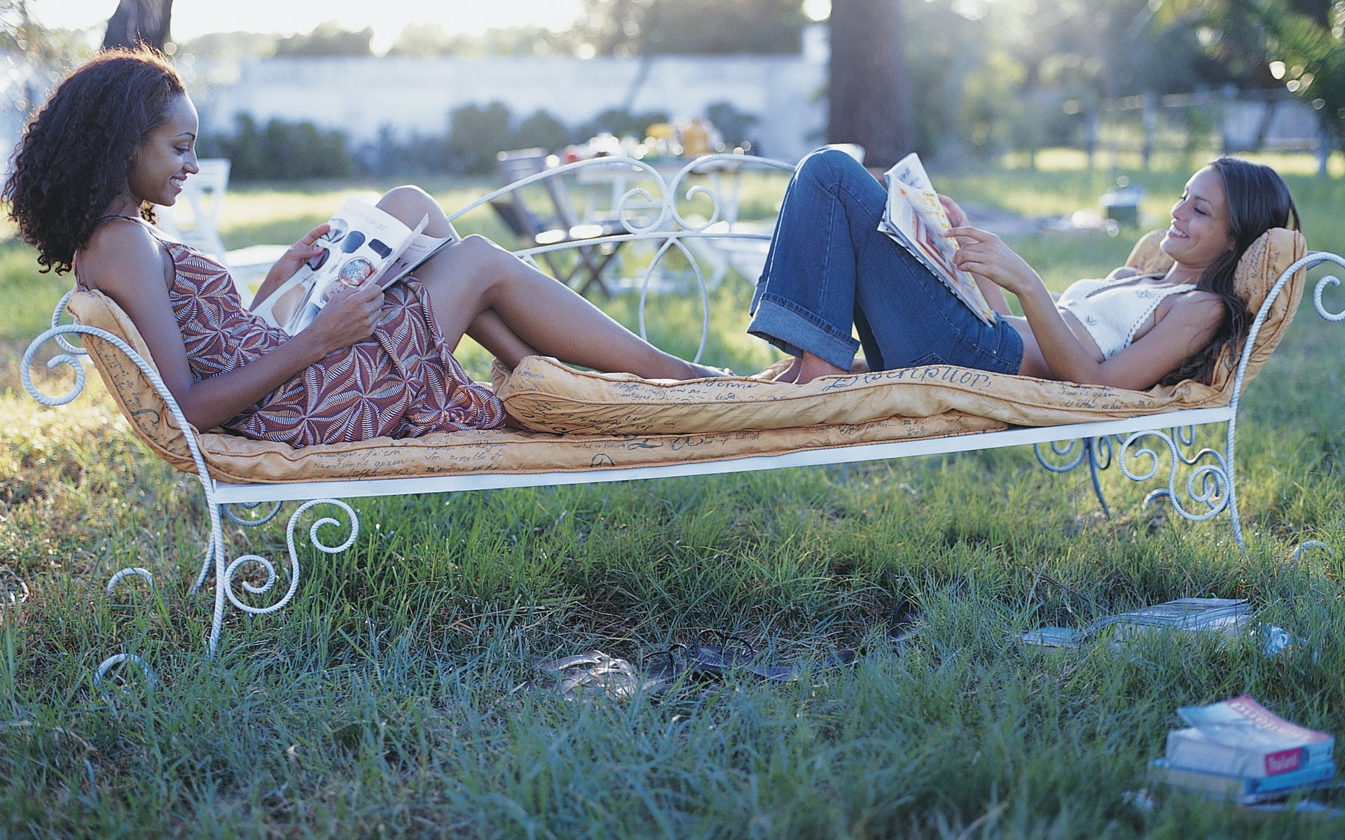 Deux filles se trouvent sur un banc et lire des magazinesDeux filles se trouvent sur un banc et lire des magazines