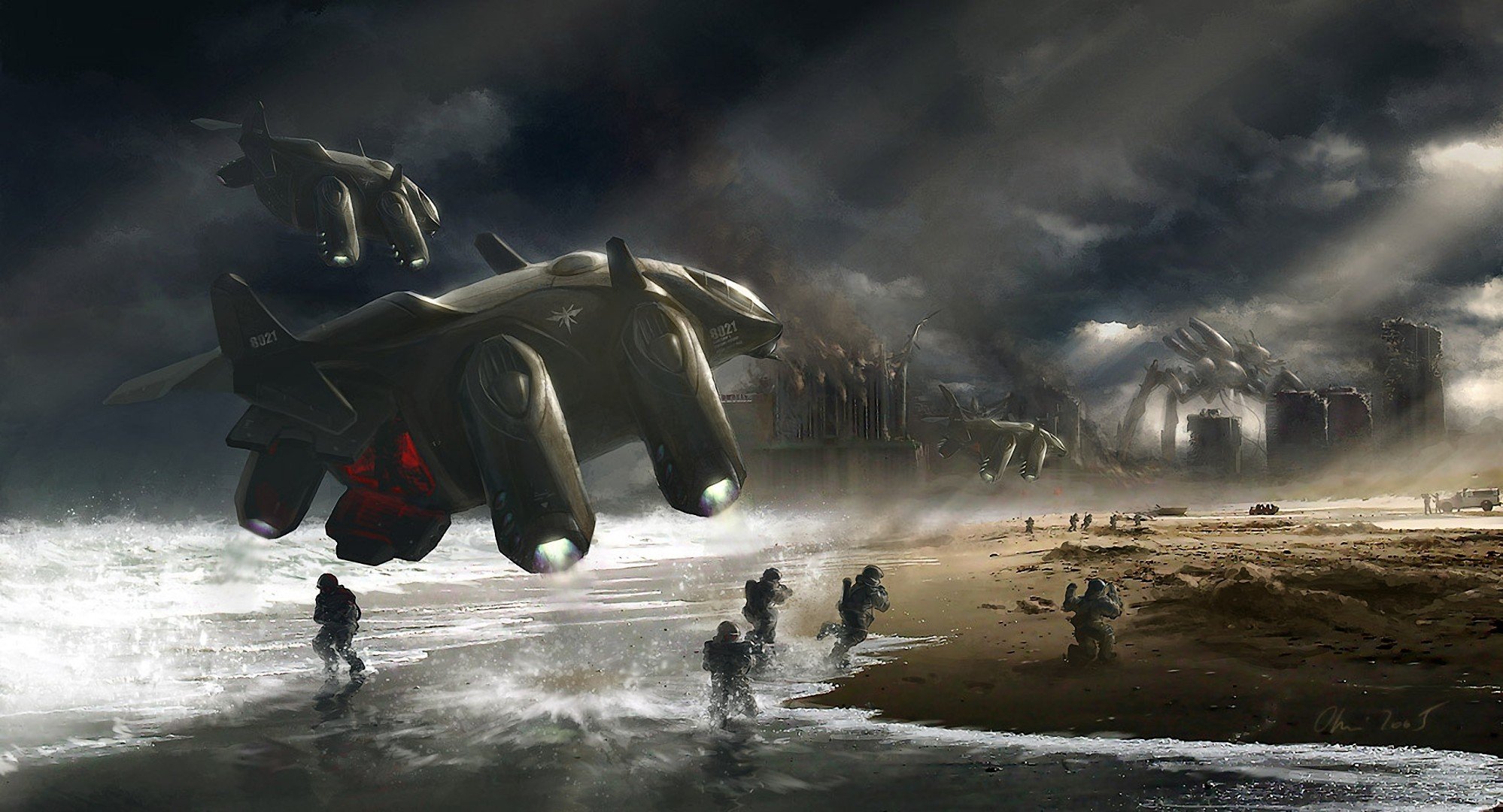 Un vaisseau spatial disantise des soldats sur la plageUn vaisseau spatial disantise des soldats sur la plage