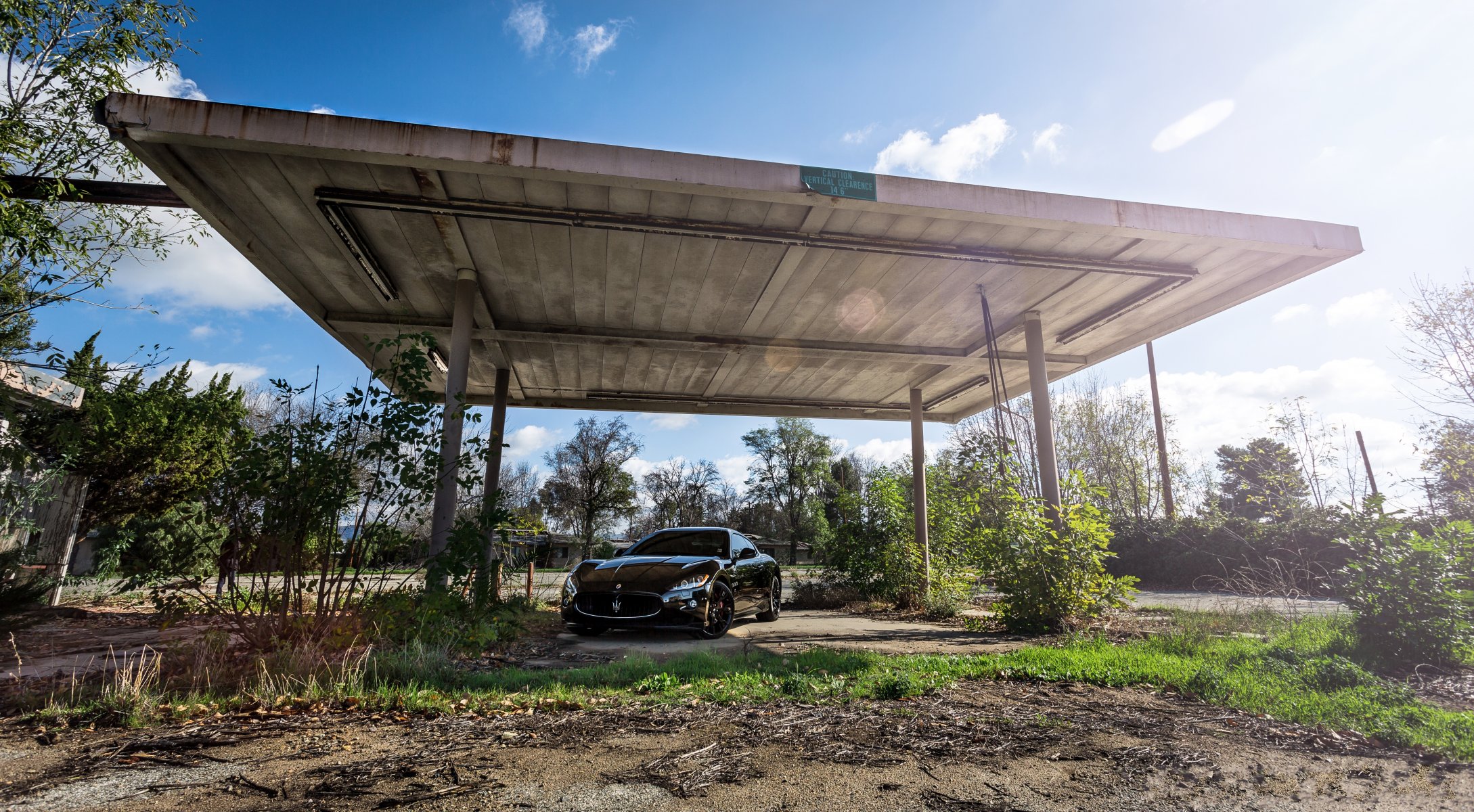Maserati dans la nature debout sous un immense auventMaserati dans la nature debout sous un immense auvent