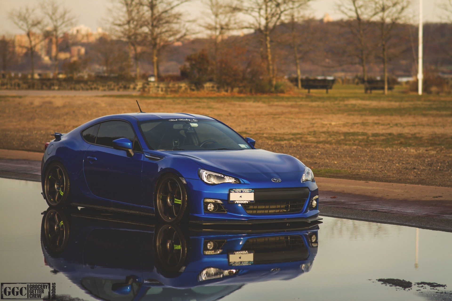 Ford Mustang rouge à côté debout sur fond de garages jaunes