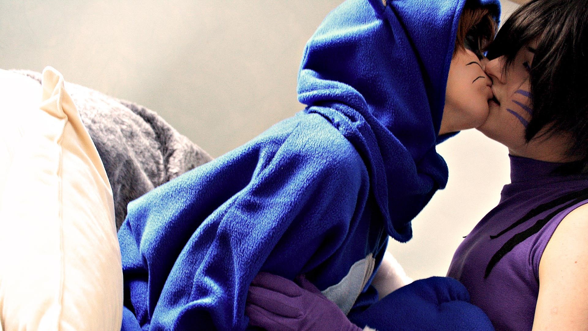 Le gars et la fille avec нарисованеыми moustache s embrassent