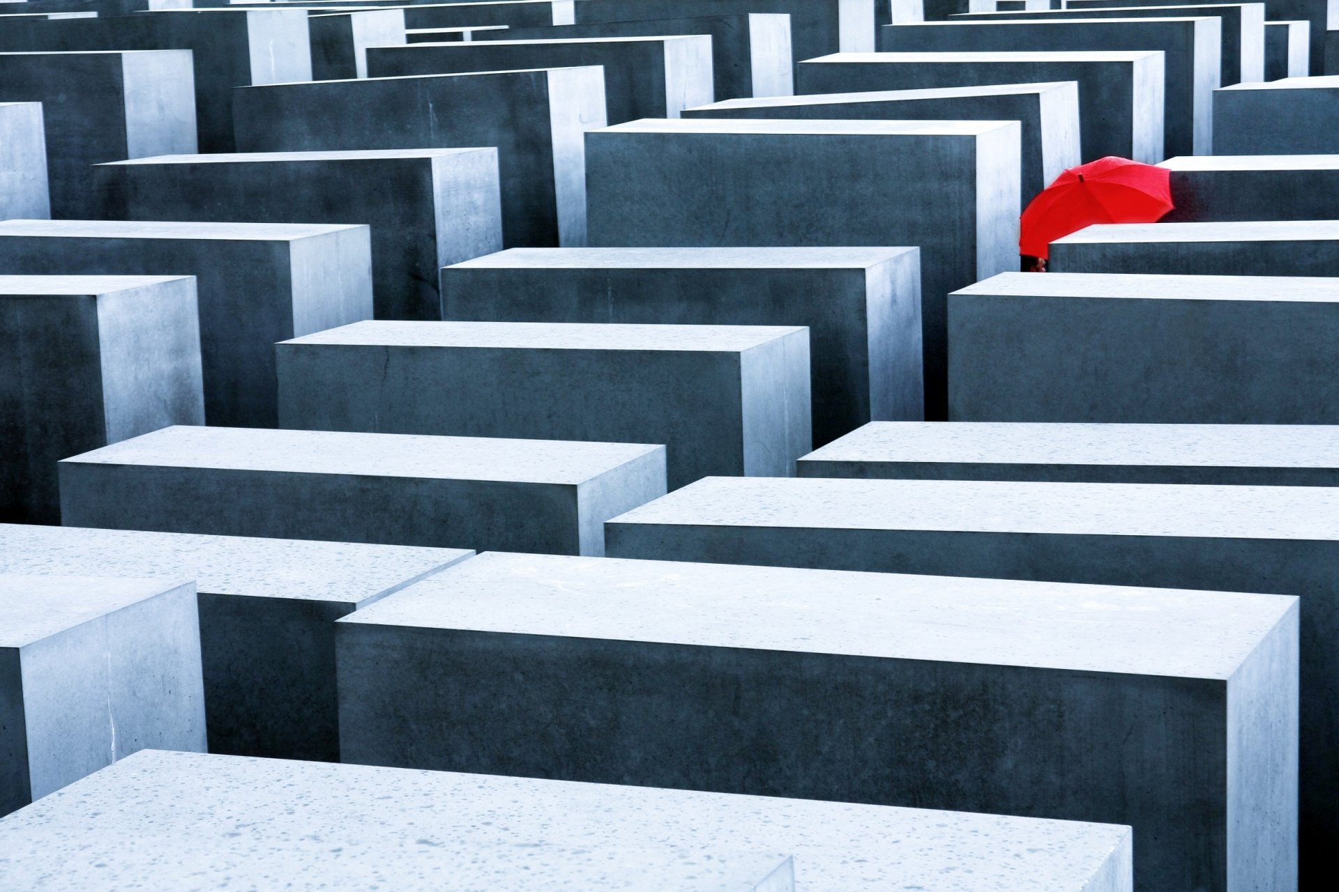 Beaucoup de dalles grises et de murs de tailles différentes, et un parapluie rouge à côté de l'un d'euxBeaucoup de dalles grises et de murs de tailles différentes, et un parapluie rouge à côté de l'un d'eux