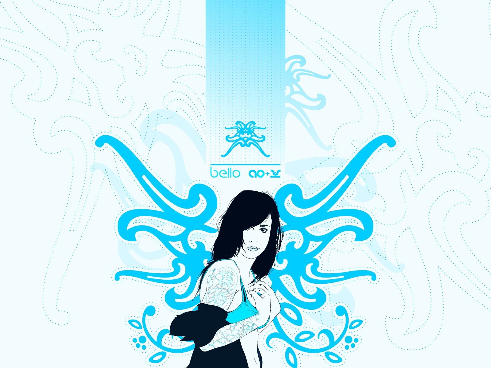 Fille avec des tatouages sur le bras sur fond de motifs bleusFille avec des tatouages sur le bras sur fond de motifs bleus