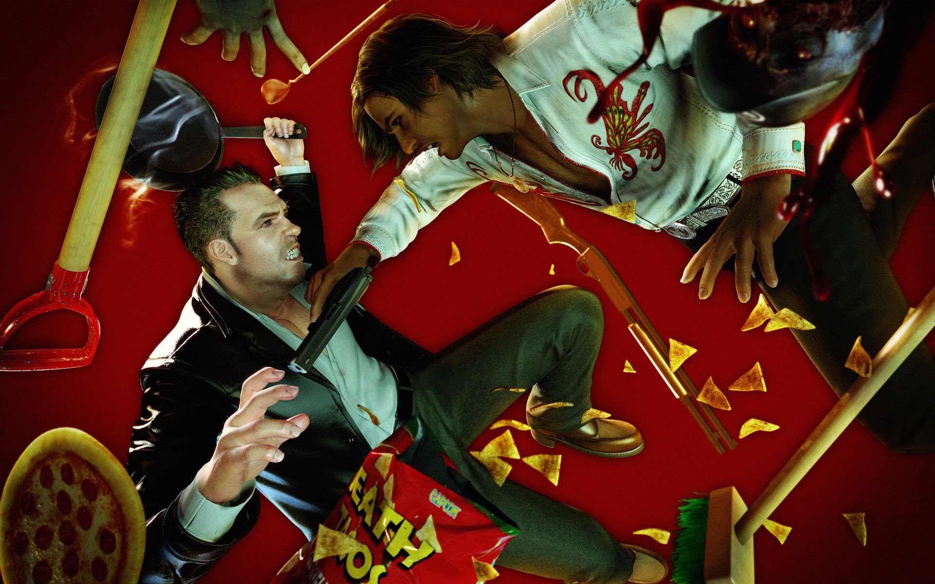 Homme agressif avec une poêle à frire dans les mains. Un homme avec un pistolet dans les mains. Combat d'hommes sur fond de pizza et de chips de nachos
