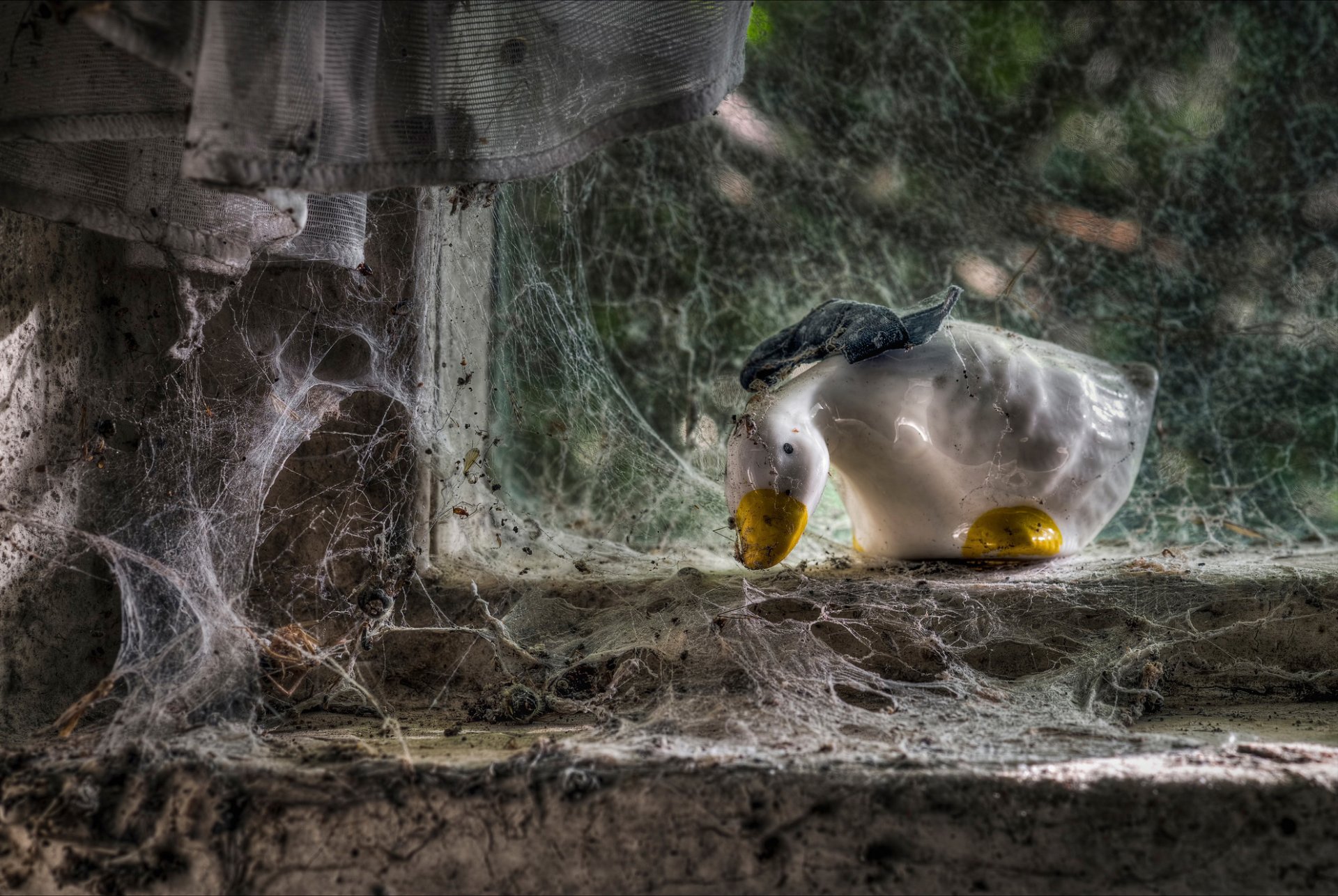 Fenêtre dans une toile d'araignée avec une figure d'oie