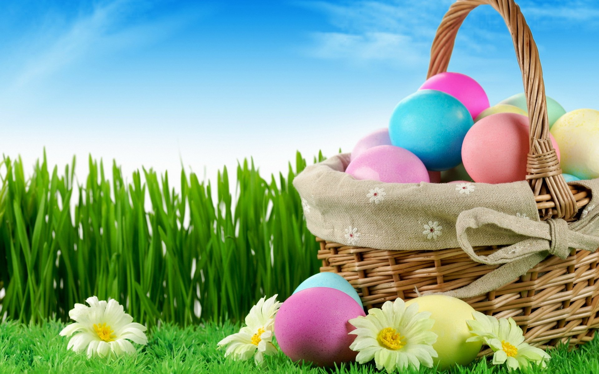 Sur l'herbe verte à côté d'un panier de fleurs se trouvent des oeufs de pâquesSur l'herbe verte à côté d'un panier de fleurs se trouvent des oeufs de Pâques