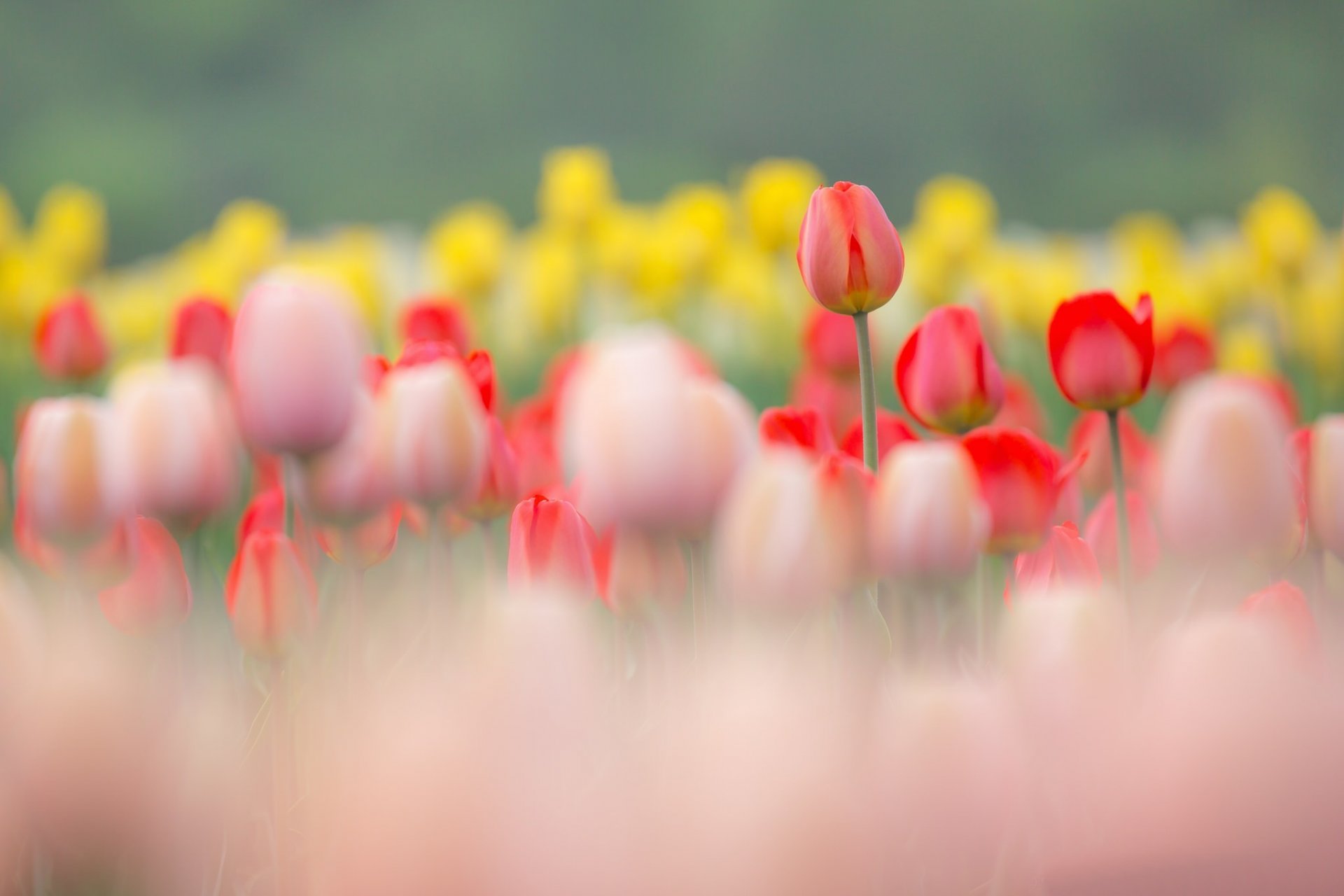 Un champ de tulipes roses comme dans un ensemble, se penchant les uns vers les autres, rappellent l'arrivée de la chaleur et les fils des jours d'hiverUn champ de tulipes roses comme dans un ensemble, se penchant les uns vers les autres, rappellent l'arrivée de la chaleur et les fils des jours d'hiver