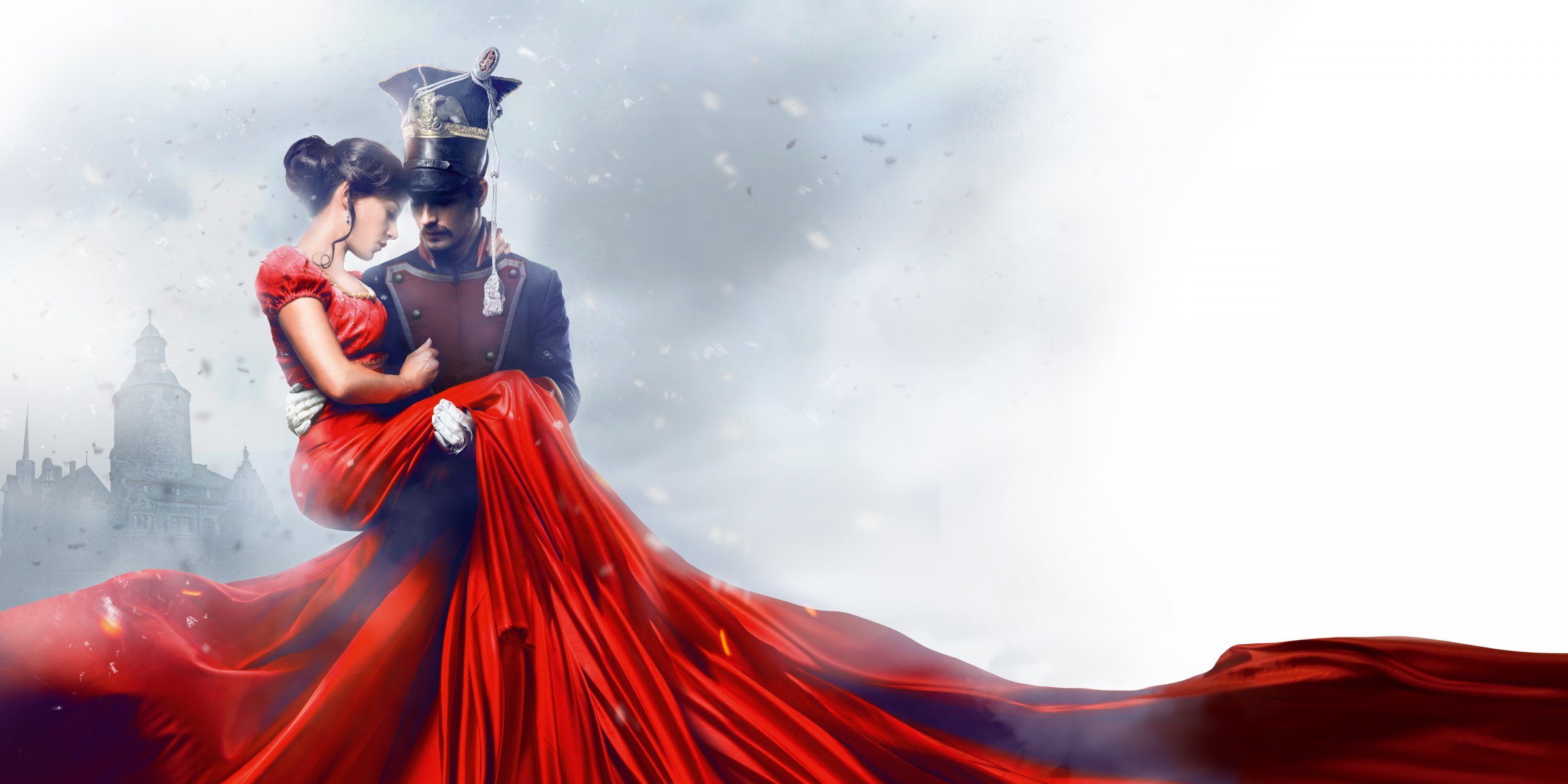 1812, fille de ballade Ulan en robe rouge sur les mains d'un soldat