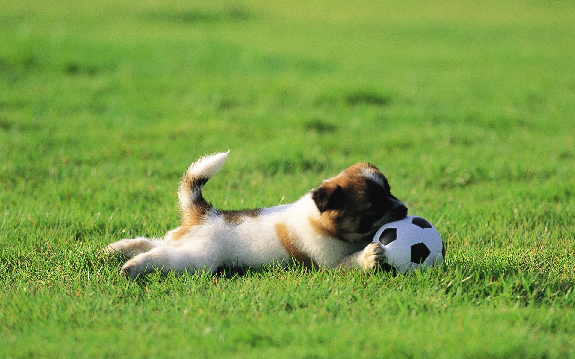 Petit chiot se trouve sur la pelouse avec un ballon de football