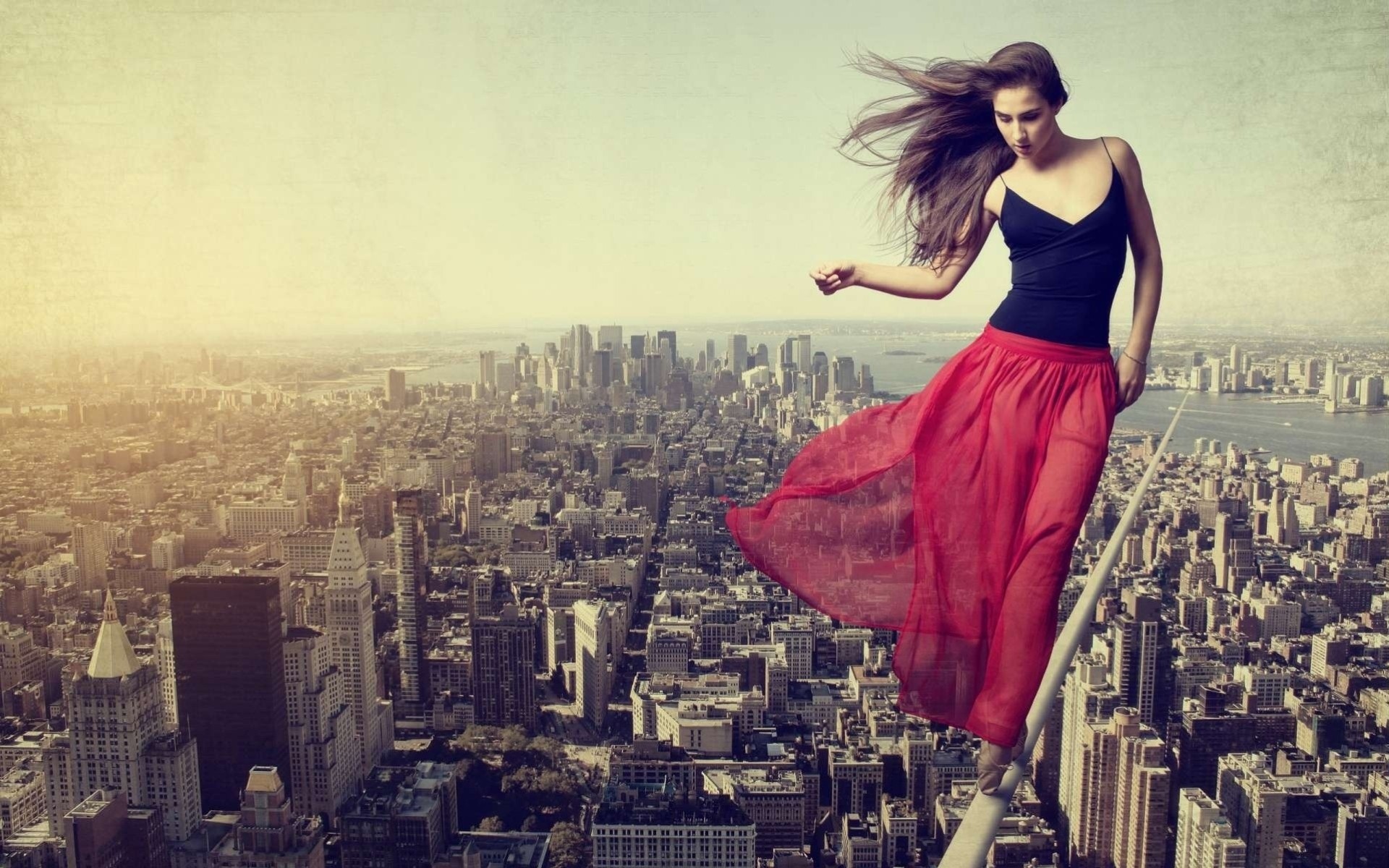 Fille sur un poteau à une hauteur au-dessus de la ville