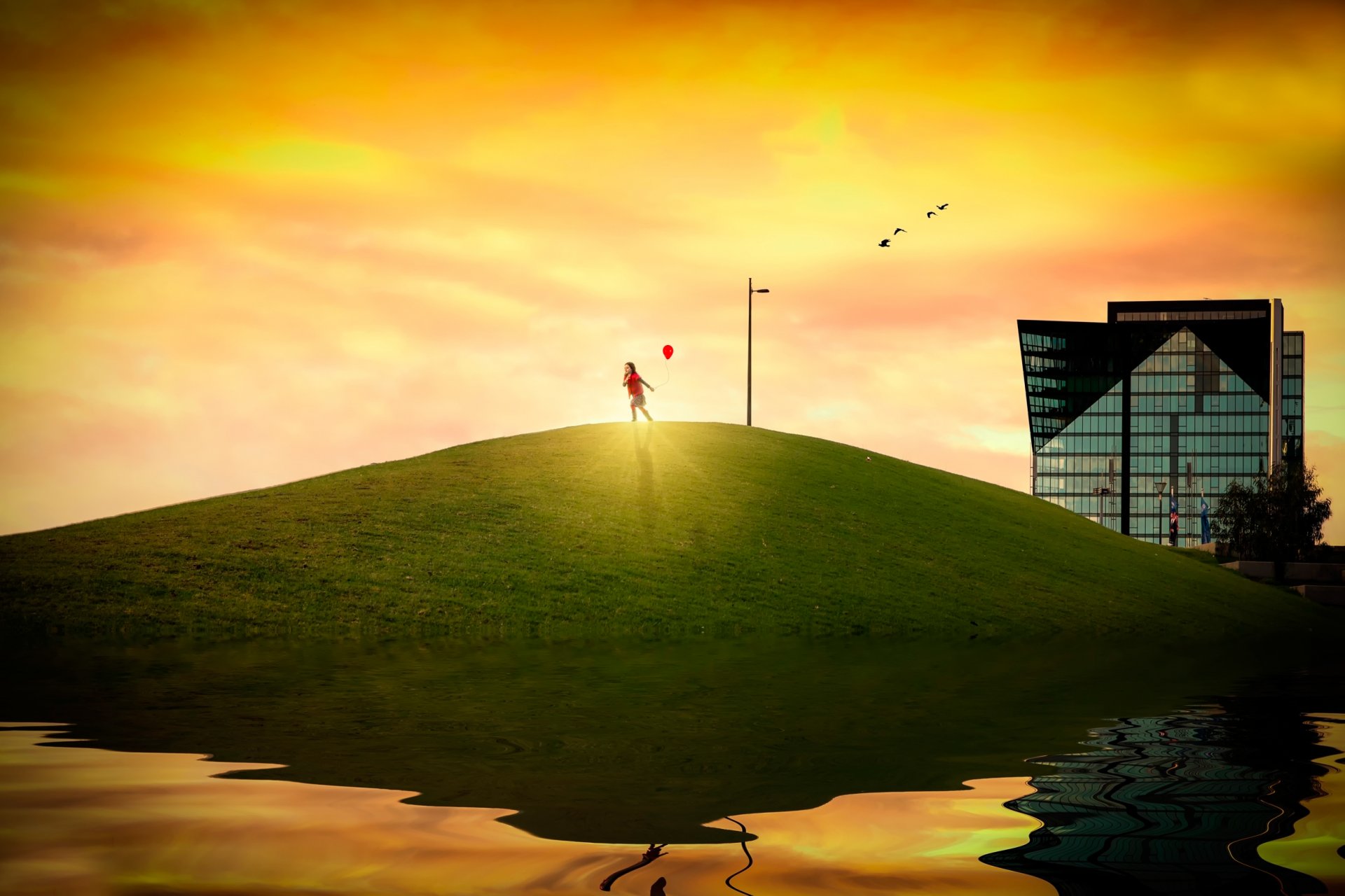 Drôle de fille assise sur l'herbe et tenant une boule roseDrôle de fille assise sur l'herbe et tenant une boule rose