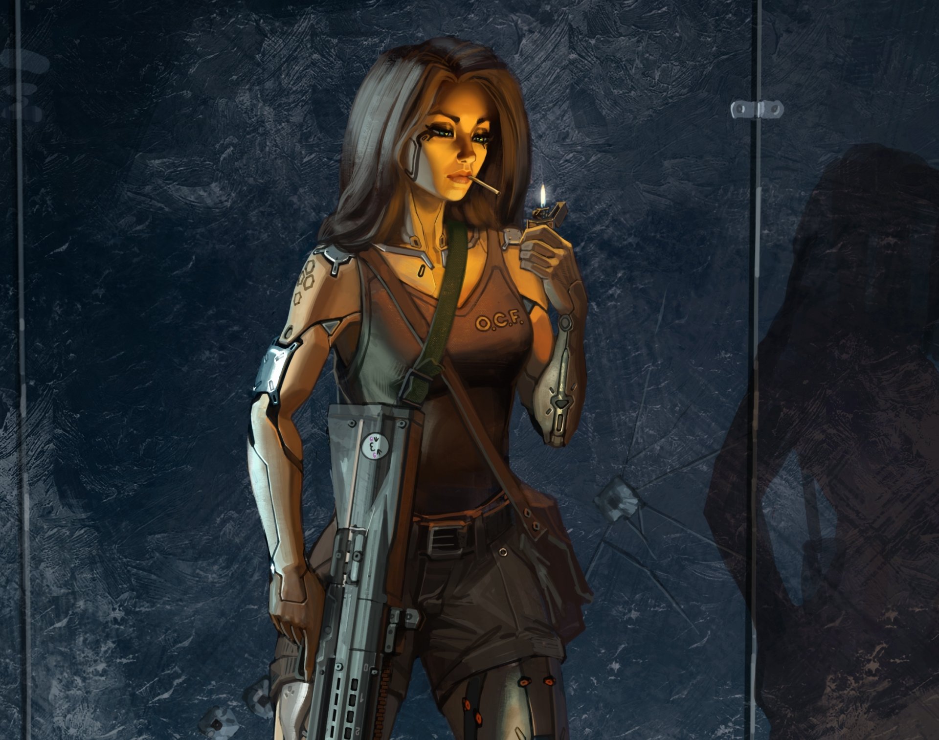 Fille avec une mitraillette dans les mains de fumer une cigaretteFille avec une mitraillette dans les mains de fumer une cigarette