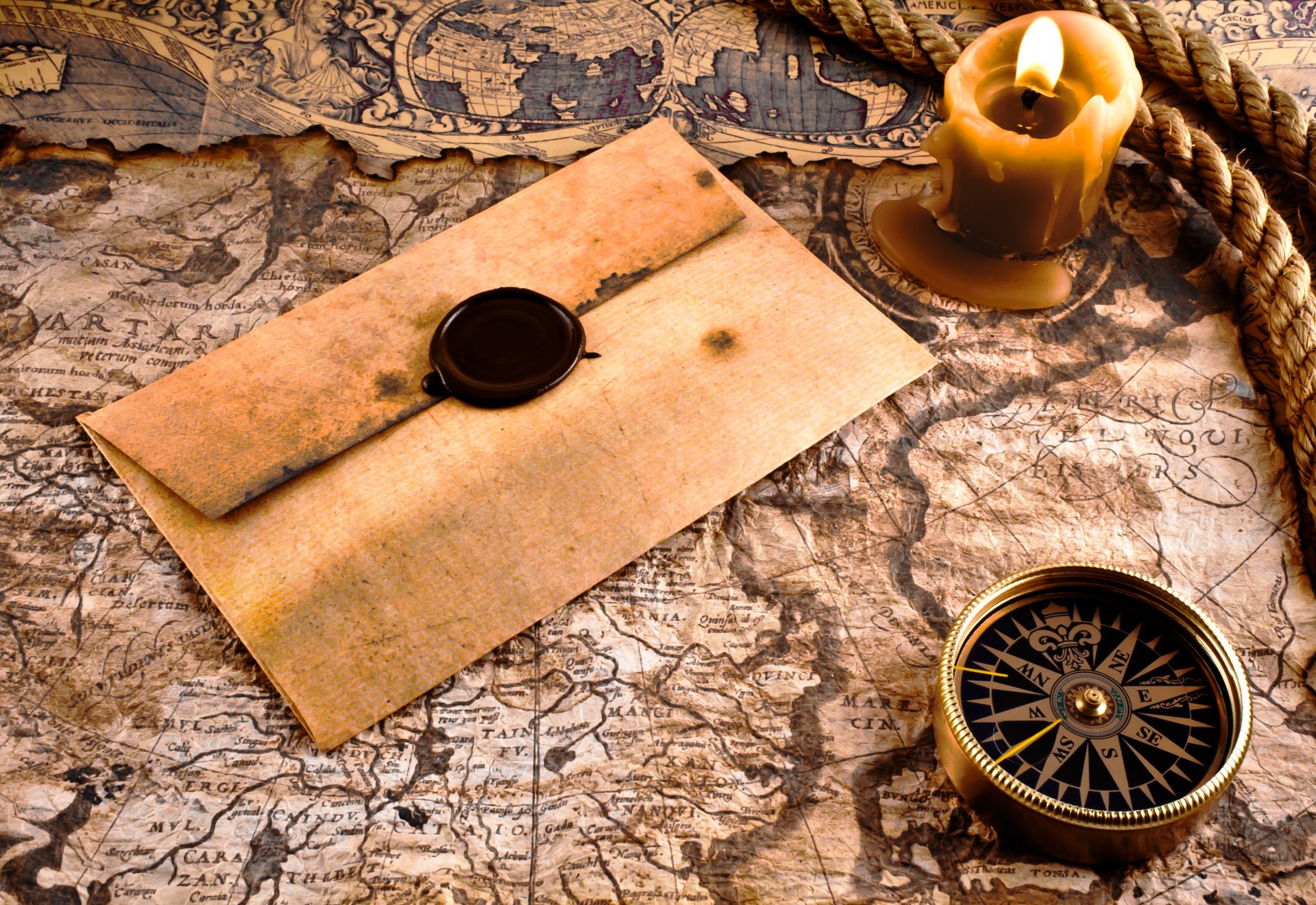 Sur la carte se trouve une enveloppe avec une boussoleSur la carte se trouve une enveloppe avec une boussole