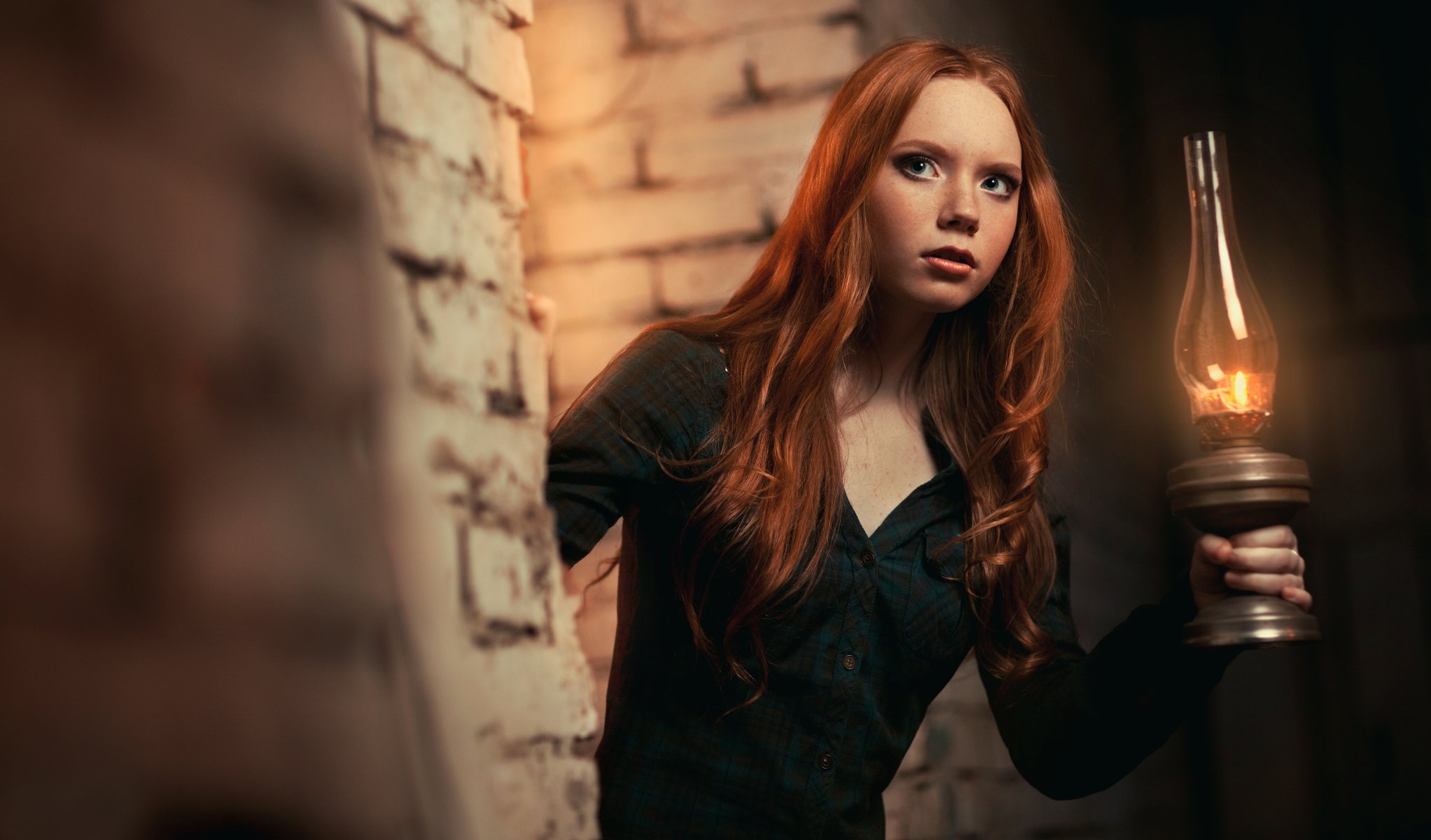 Rousse fille avec une lampe dans un endroit sombreRousse fille avec une lampe dans un endroit sombre