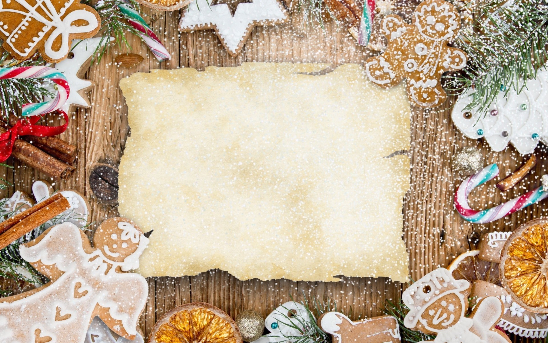 Jouets de Noël sur une table en bois autour d'une feuille blanche pour les félicitations