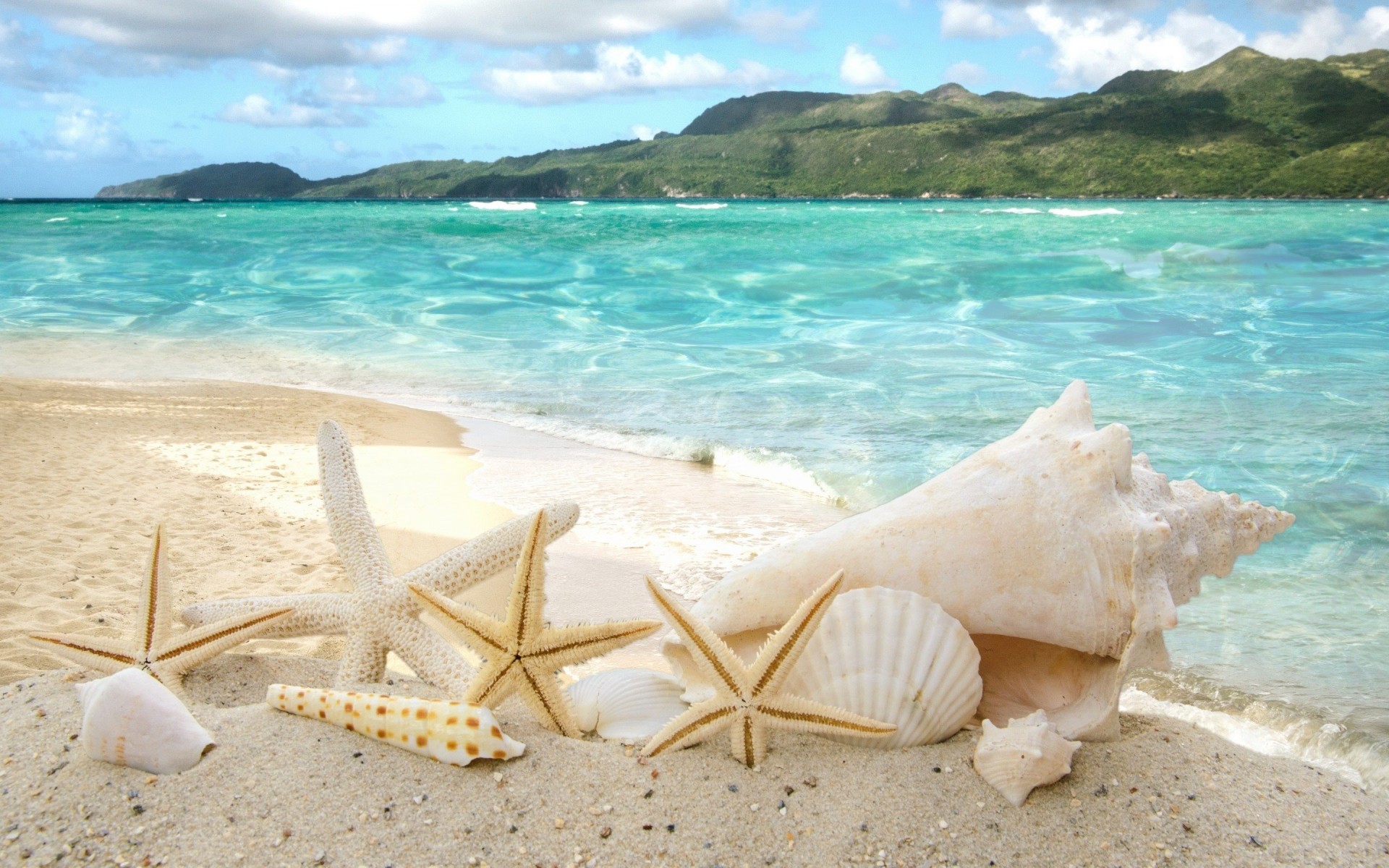 Coquillages et étoiles sur le sable sur fond de merCoquillages et étoiles sur le sable sur fond de mer