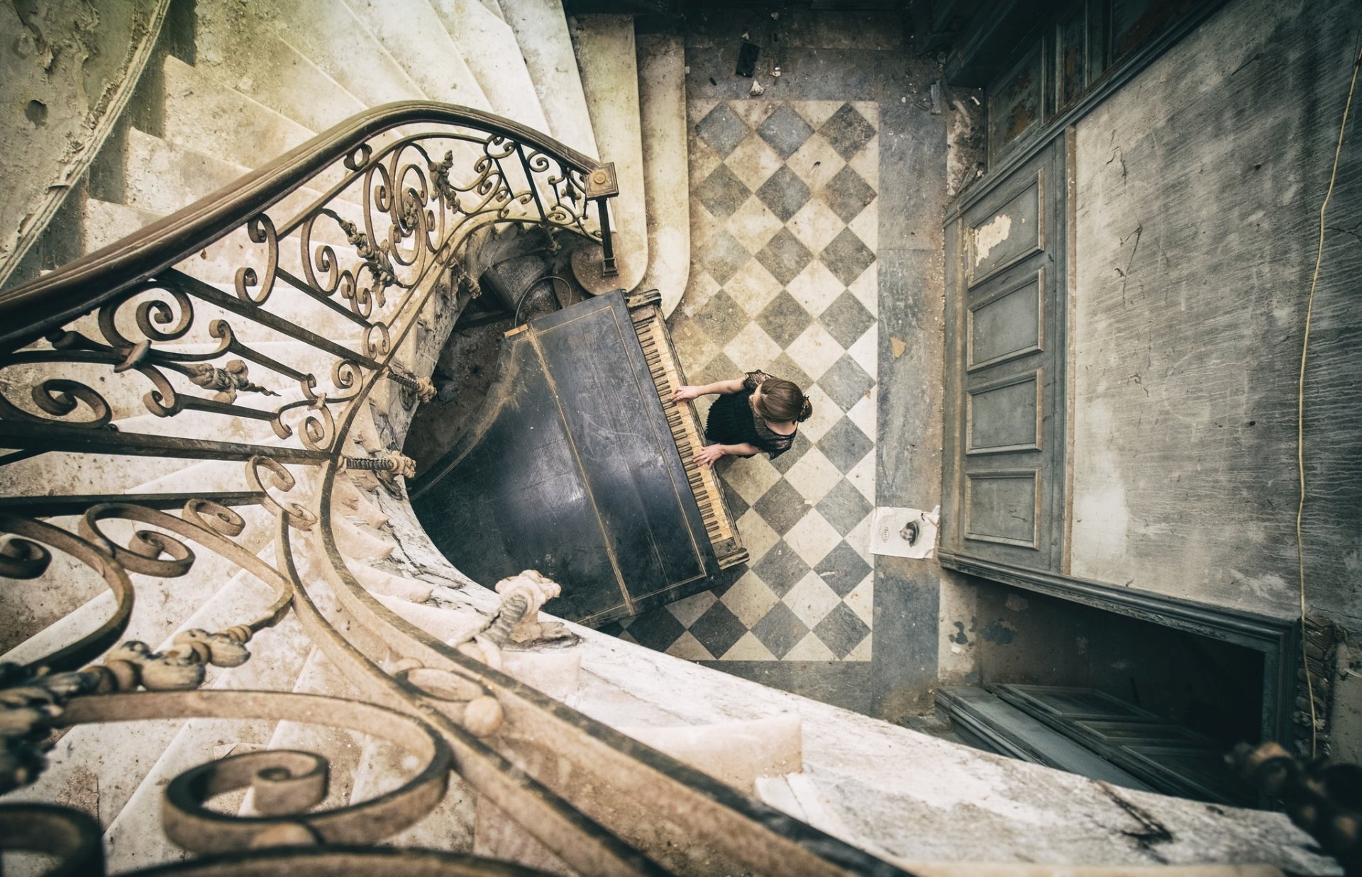 Fille jouant du piano dans une vieille maison
