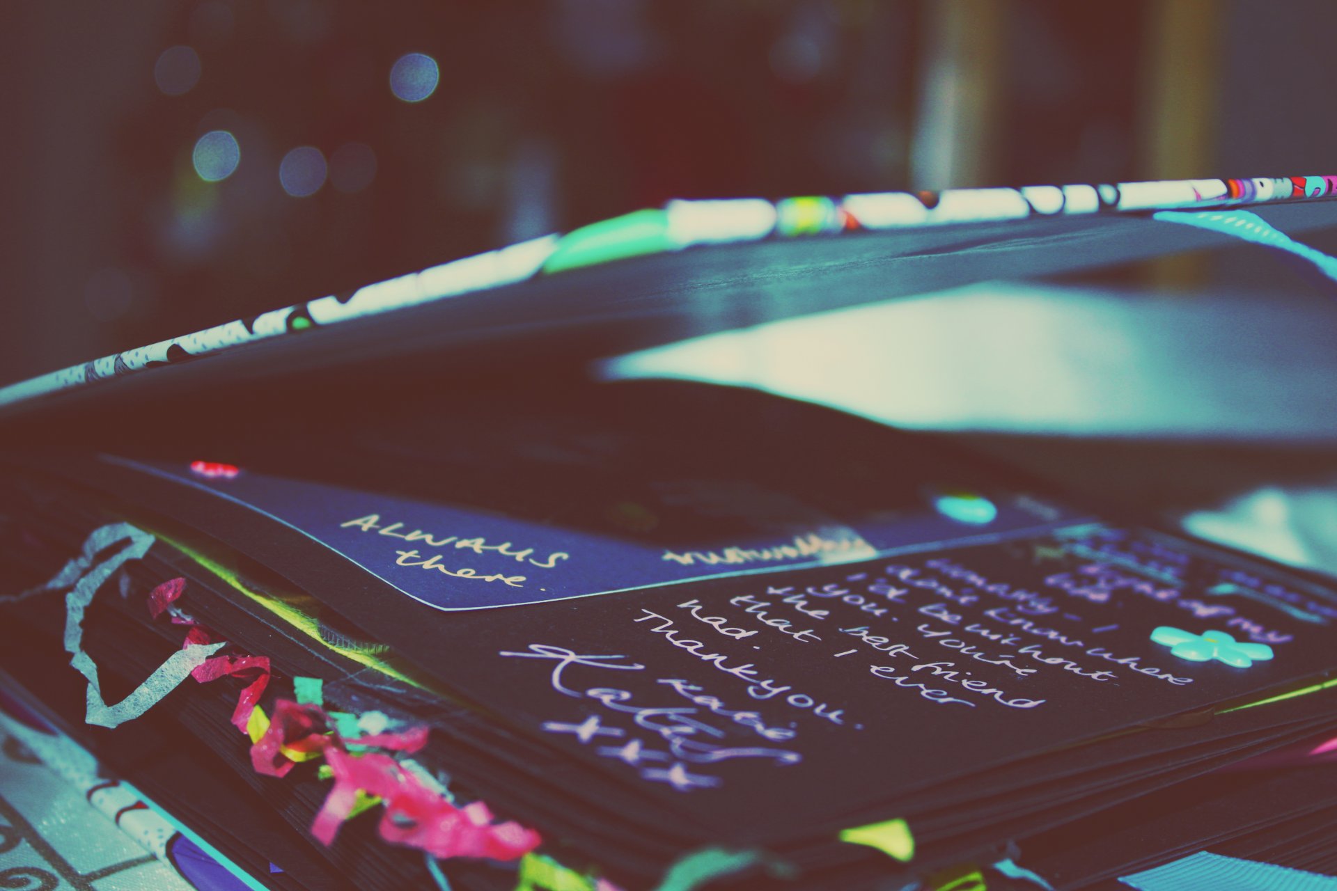 Texte écrit avec une belle écriture sur les pages noires du journalTexte écrit avec une belle écriture sur les pages noires du journal