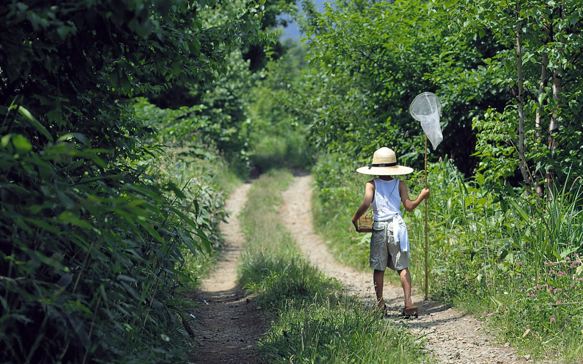 Garçon dans un chapeau avec une épuisette marchant le long du chemin