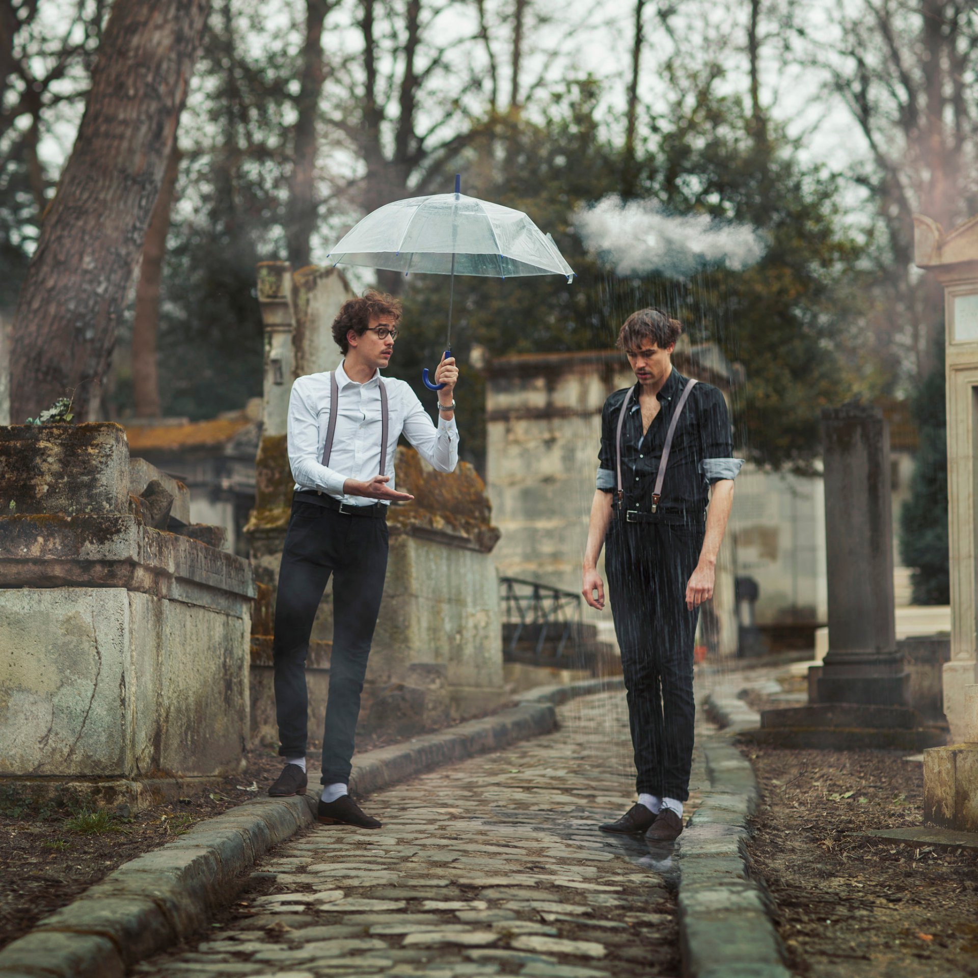 Deux hommes sous la pluie, l'un sous un parapluie