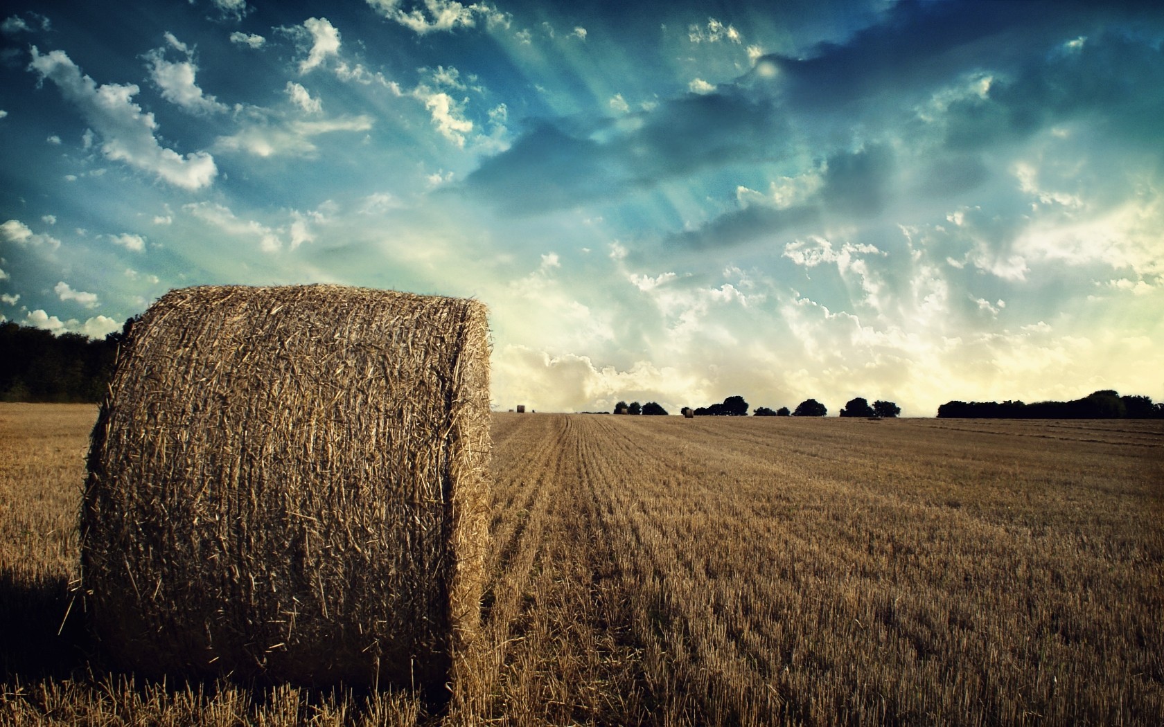 Balles avec de la paille après la récolte des céréales au coucher du soleil. strada en plein essorBalles avec de la paille après la récolte des céréales au coucher du soleil. Strada en plein essor