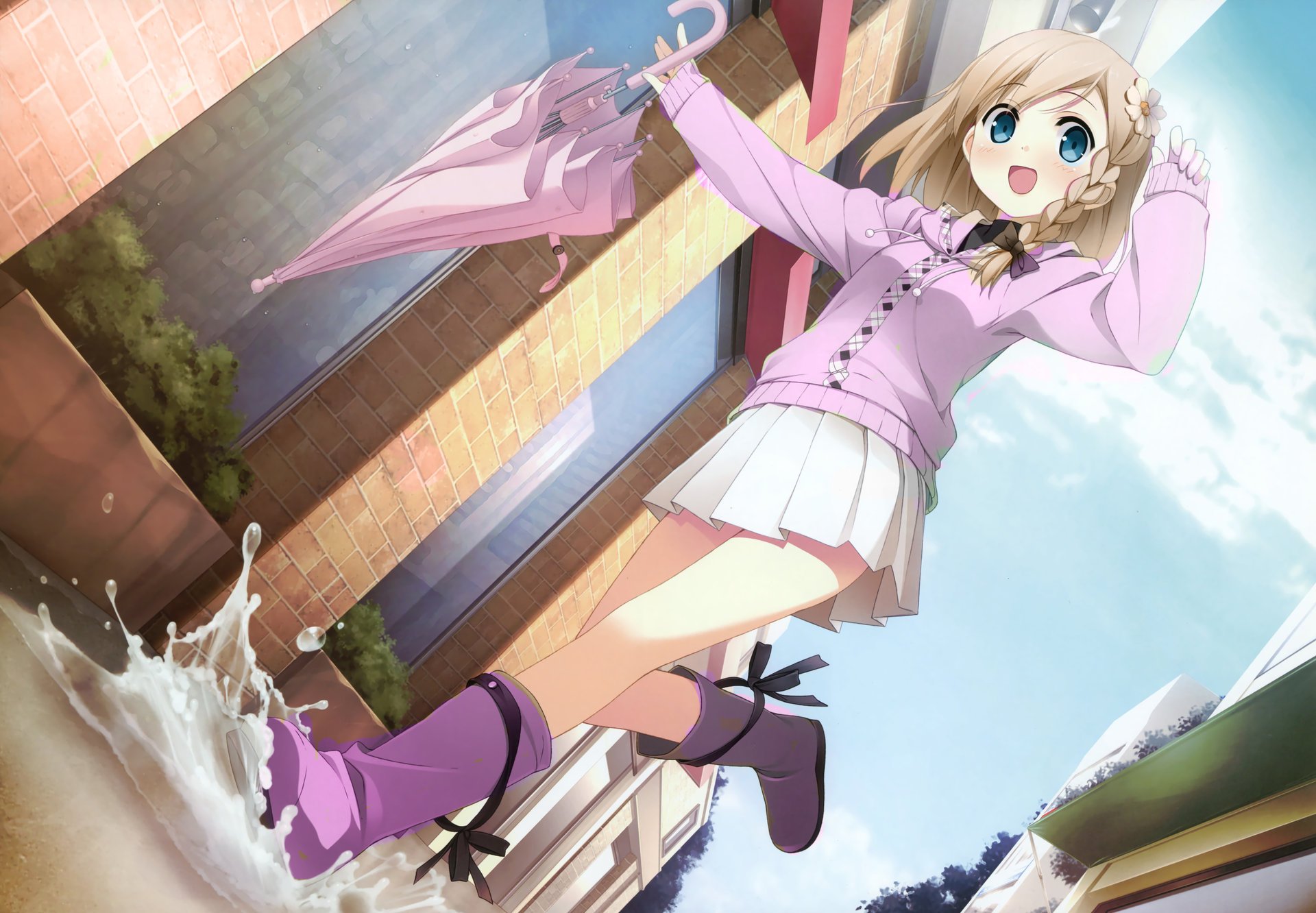 Anime girl avec un parapluie court sur les flaques d'eau