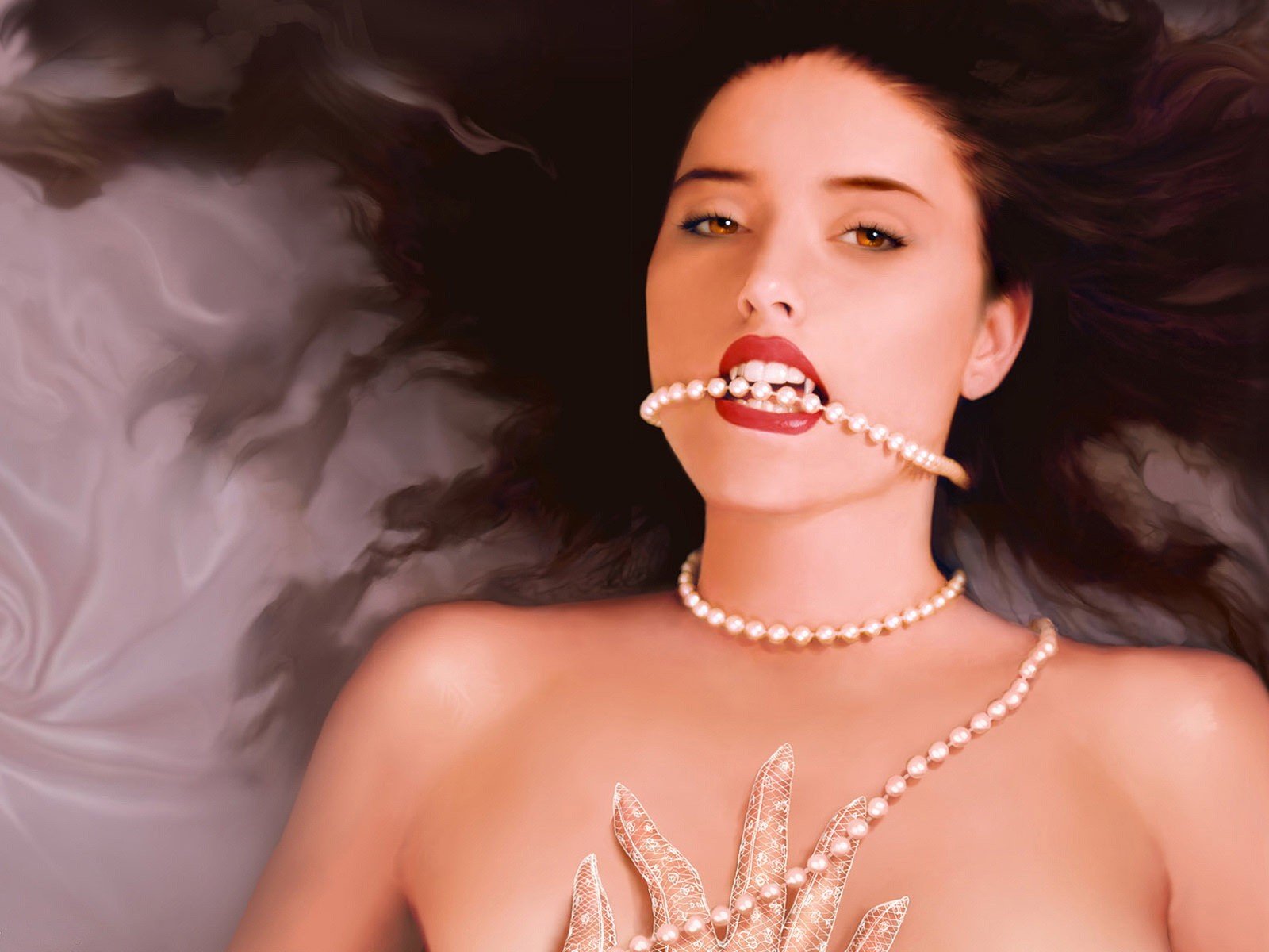Fille aux yeux bleus avec des perles dans les cheveux noirsFille aux yeux bleus avec des perles dans les cheveux noirs