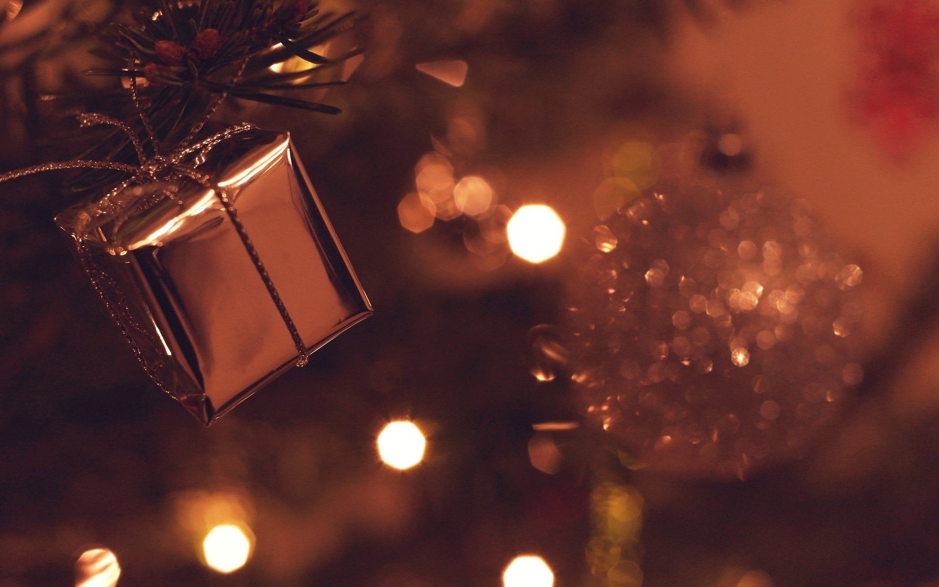 Boules de Noël et cadeau sur fond de lumières