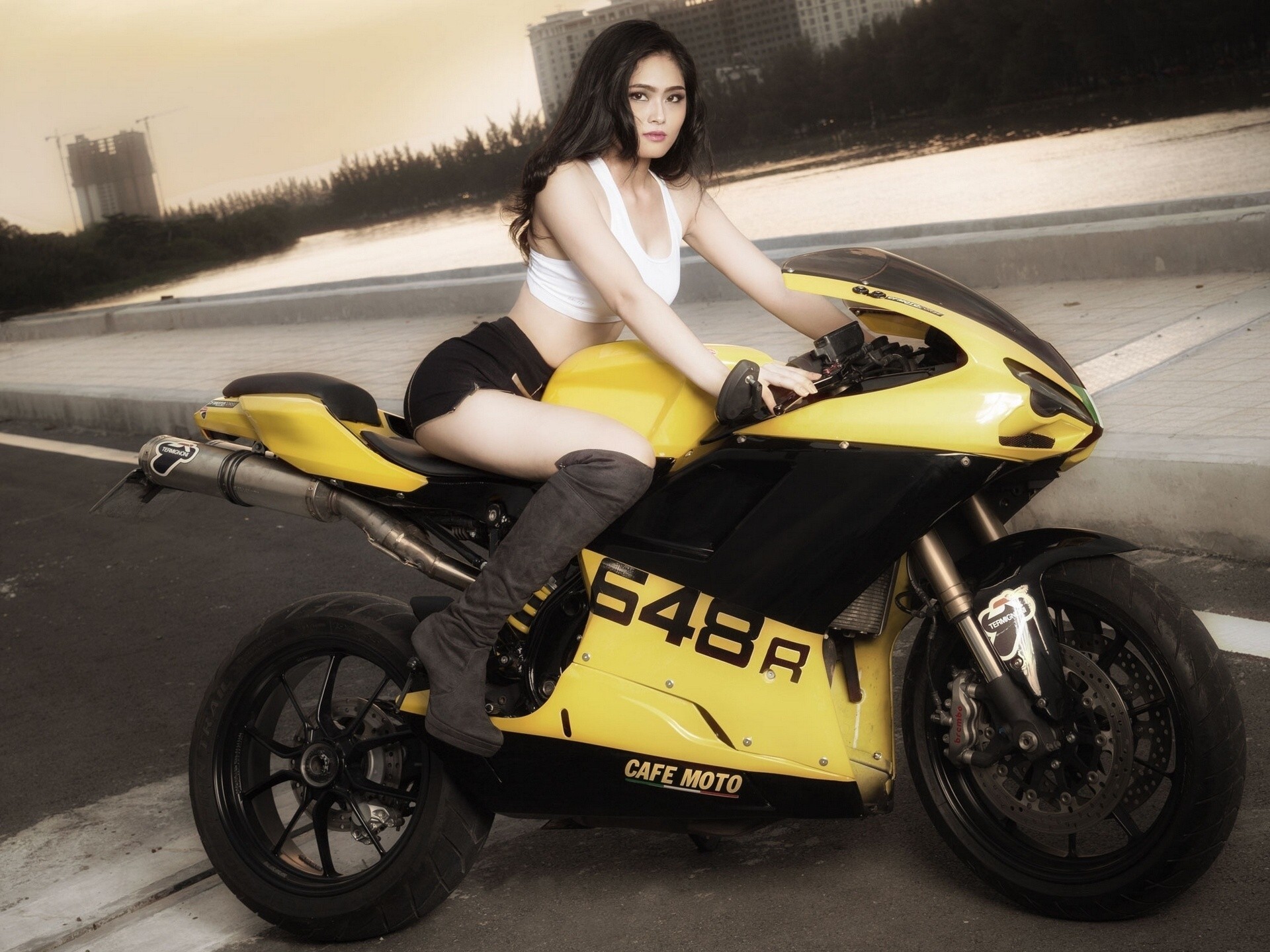 Asiatique avec les cheveux lâches est assis sur une motoAsiatique avec les cheveux lâches est assis sur une moto