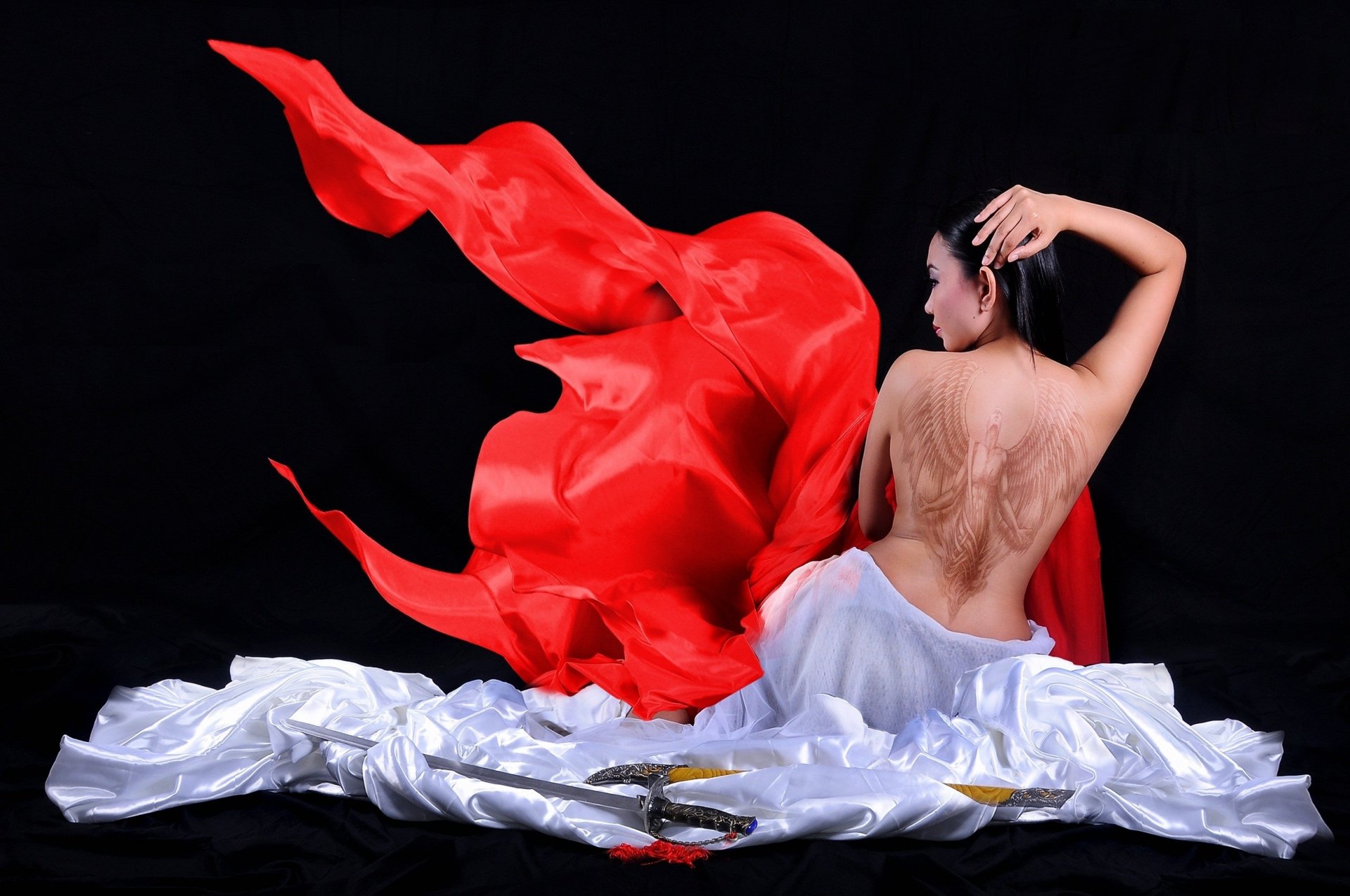Femme asiatique avec des ailes de tatouage sur fond noir