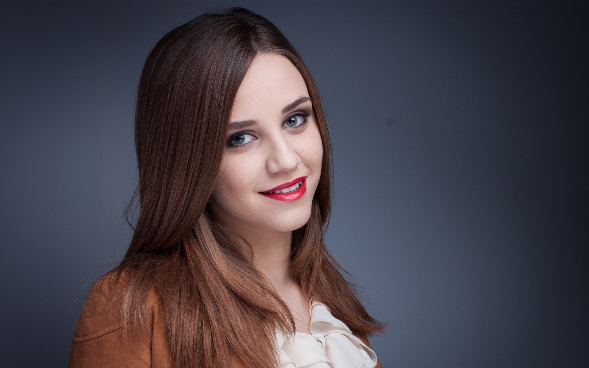 Jolie brune avec rouge à lèvres rouge sur les lèvres souriantJolie brune avec rouge à lèvres rouge sur les lèvres souriant
