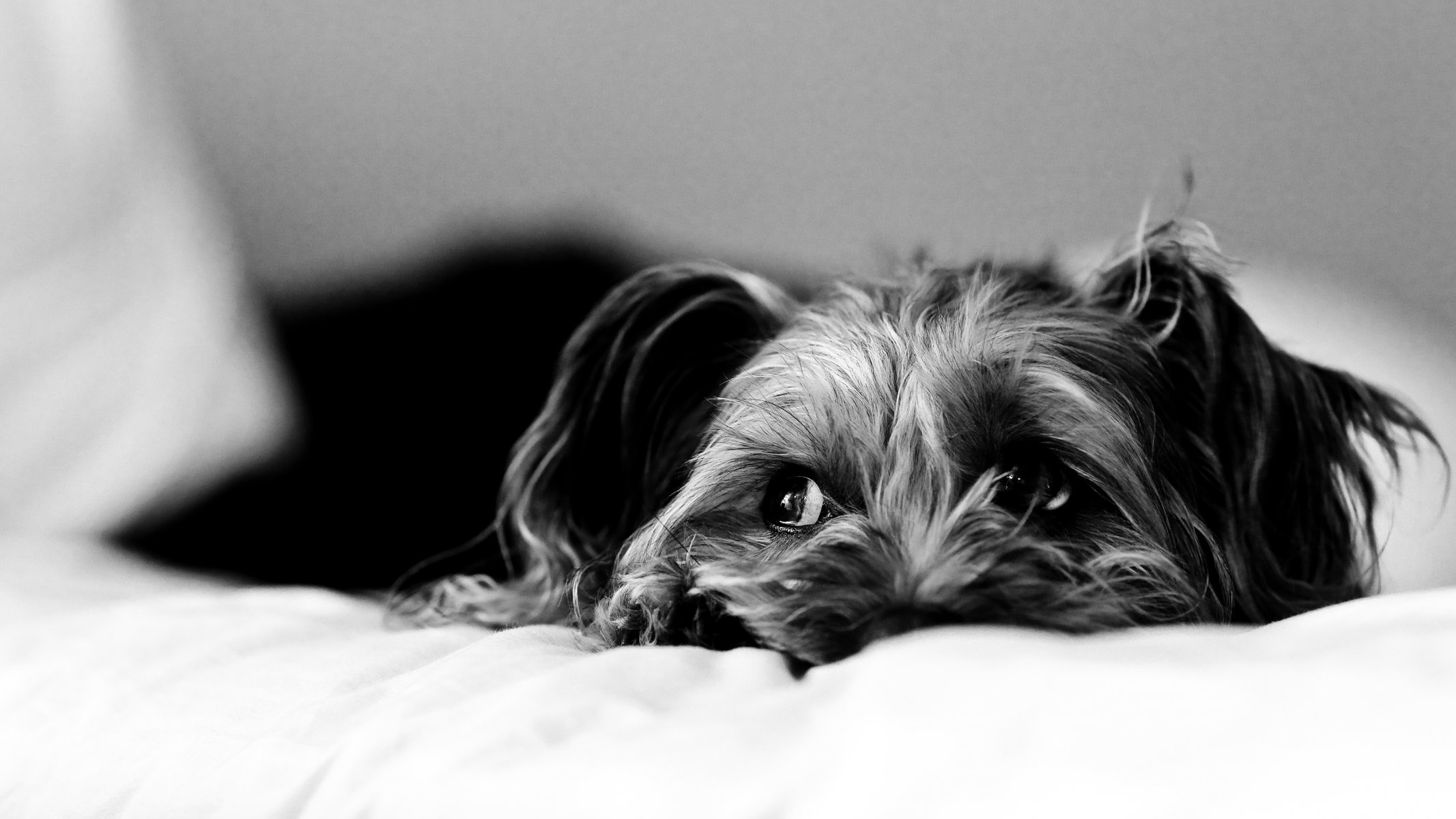Photo en noir et blanc avec un chien couché sur un drapPhoto en noir et blanc avec un chien couché sur un drap