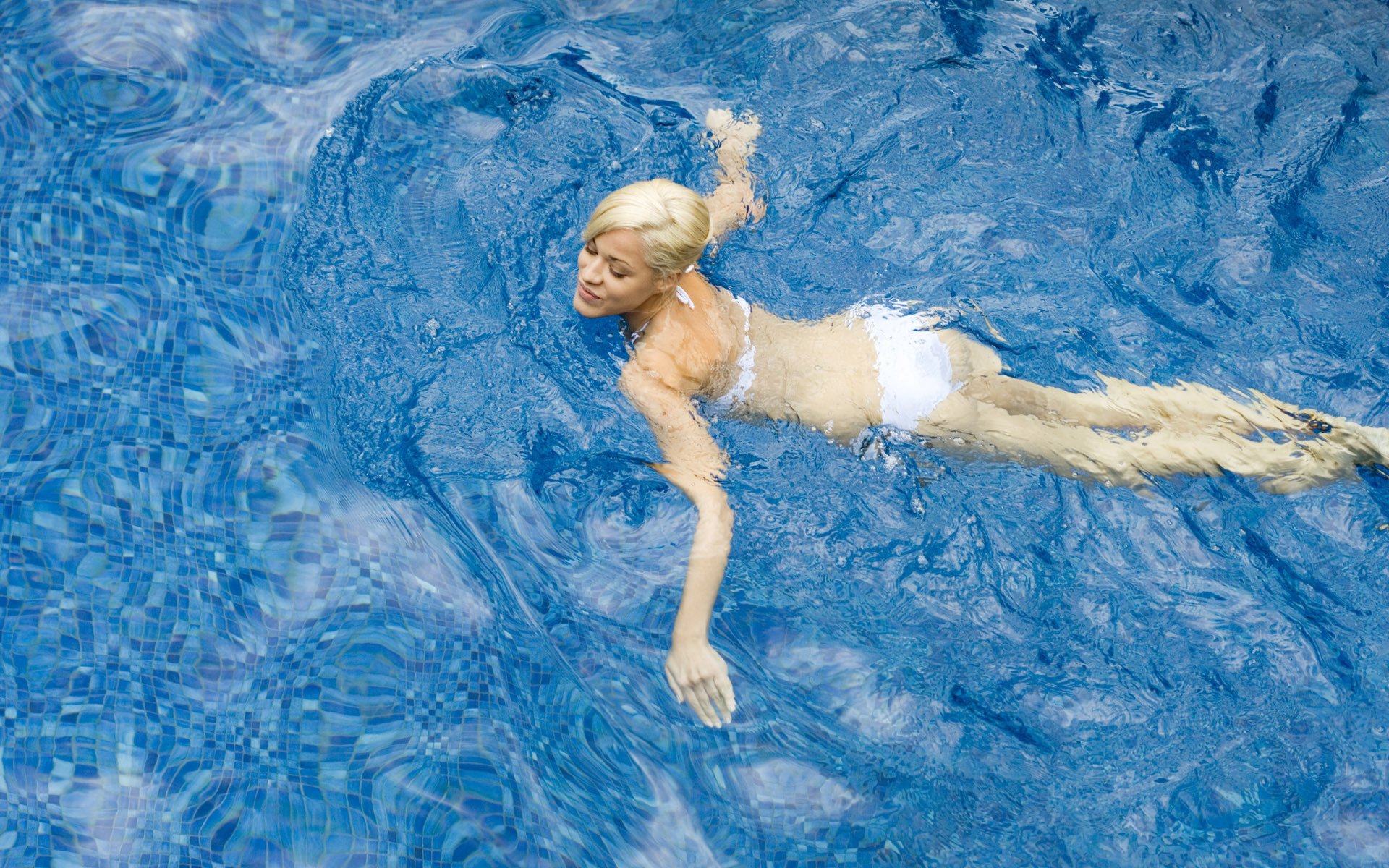 Fille blonde en maillot de bain blanc nage dans l'eauFille blonde en maillot de bain blanc nage dans l'eau