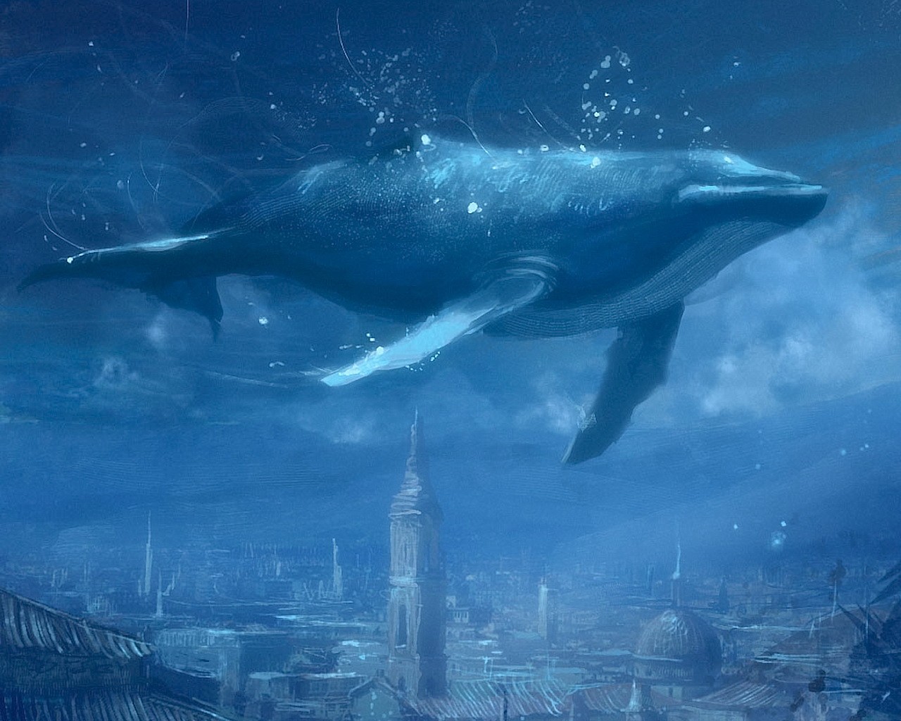 Une énorme baleine bleue flotte au-dessus d'une ville engloutieUne énorme baleine bleue flotte au-dessus d'une ville engloutie