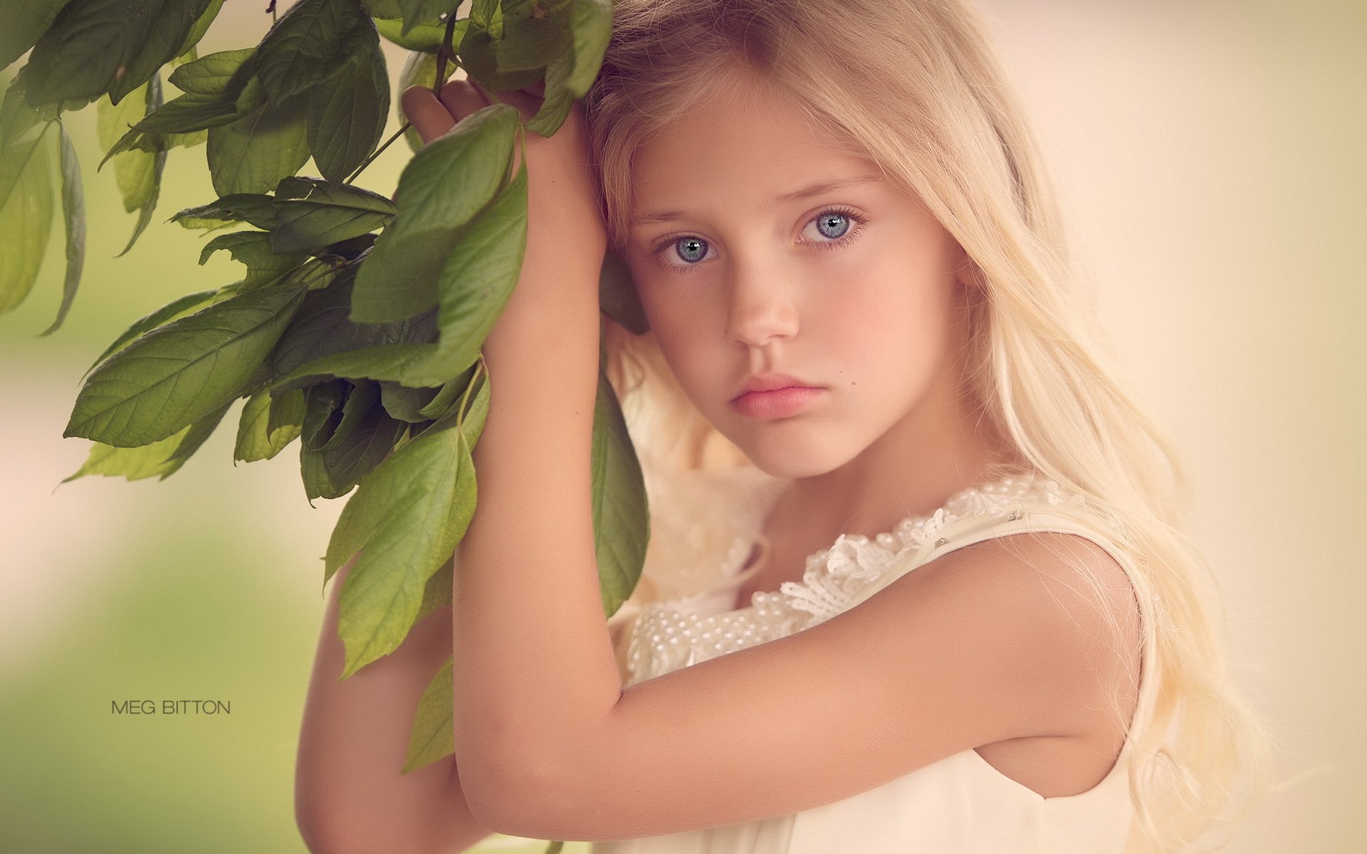 Jeune fille tenant une branche avec des feuilles vertesJeune fille tenant une branche avec des feuilles vertes