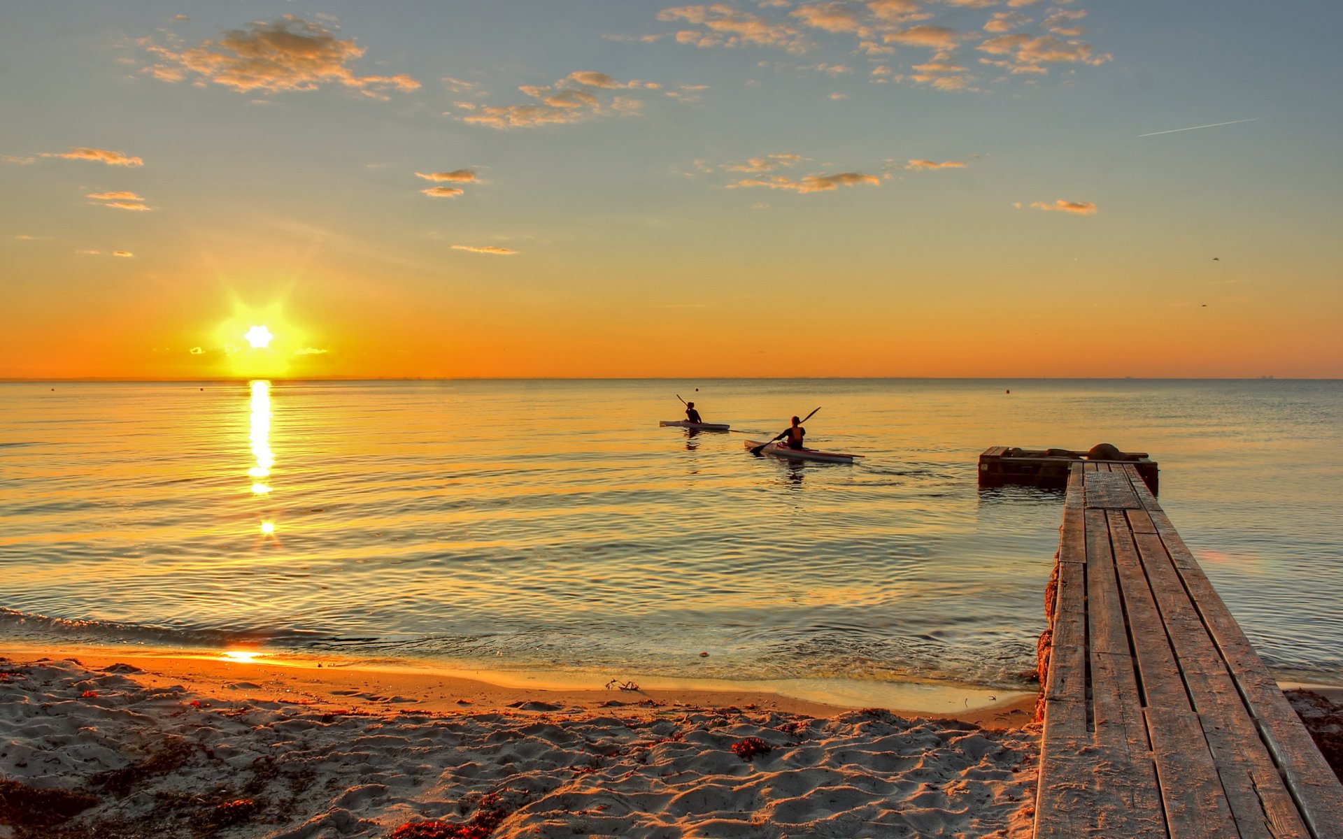 Gens dans la mer sur les bateaux au coucher du soleilGens dans la mer sur les bateaux au coucher du soleil