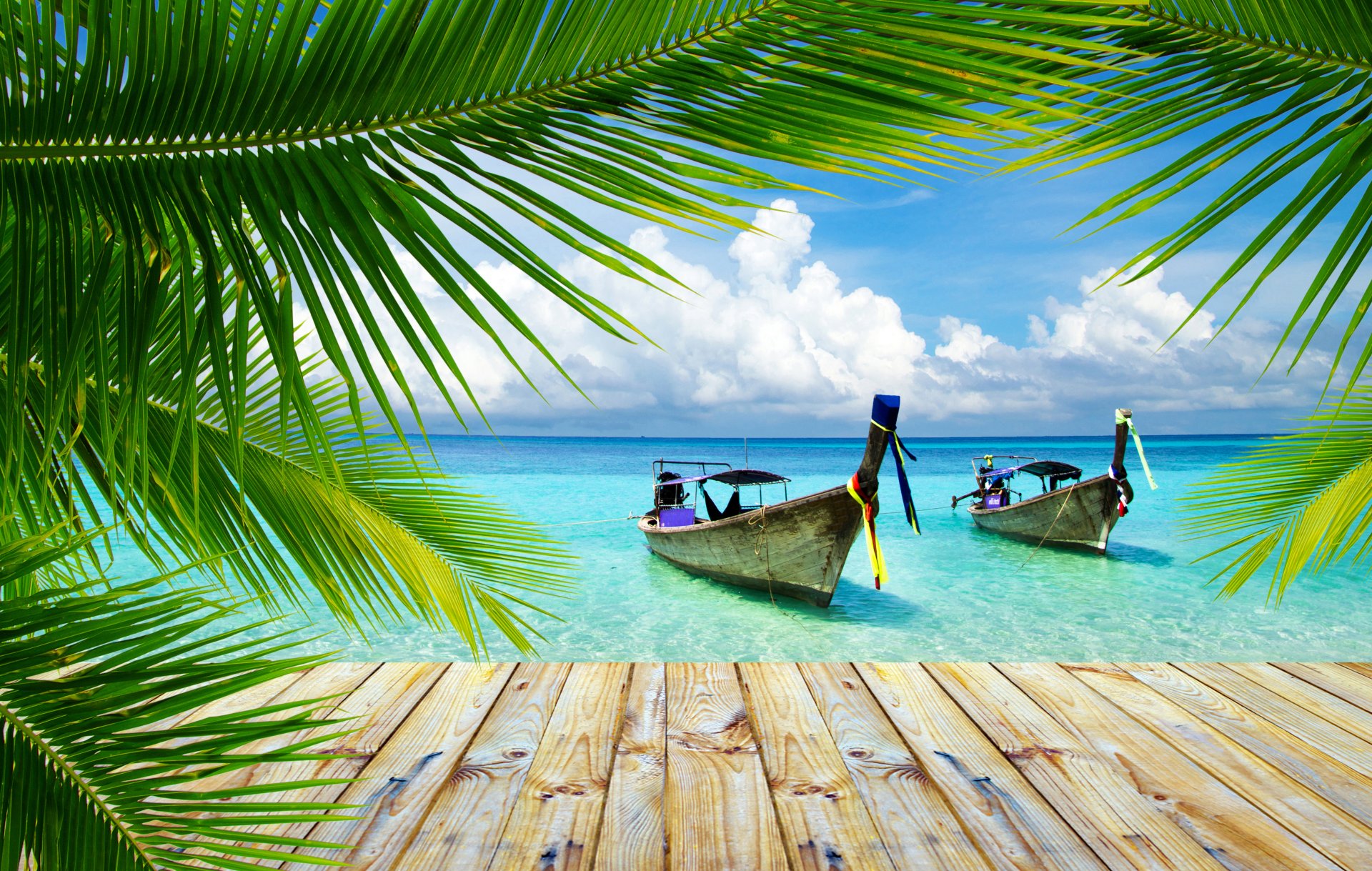Arbres, bateaux et maisons sur le front de mer sur fond de mer bleueArbres, bateaux et maisons sur le front de mer sur fond de mer bleue