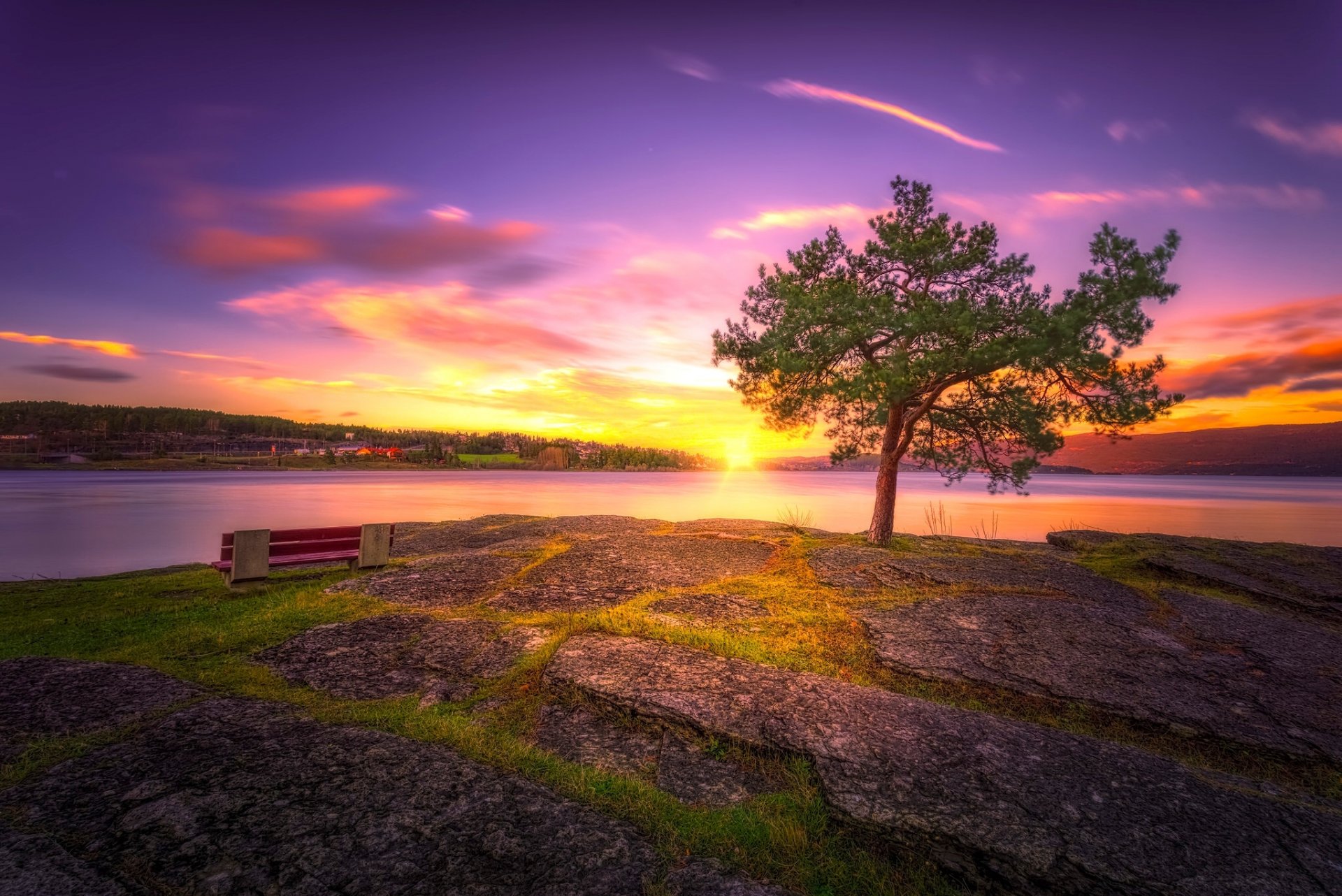 Coucher de soleil dans la savane des arbres solitaires parmi le tapis d'herbeCoucher de soleil dans la savane des arbres Solitaires parmi le tapis d'herbe