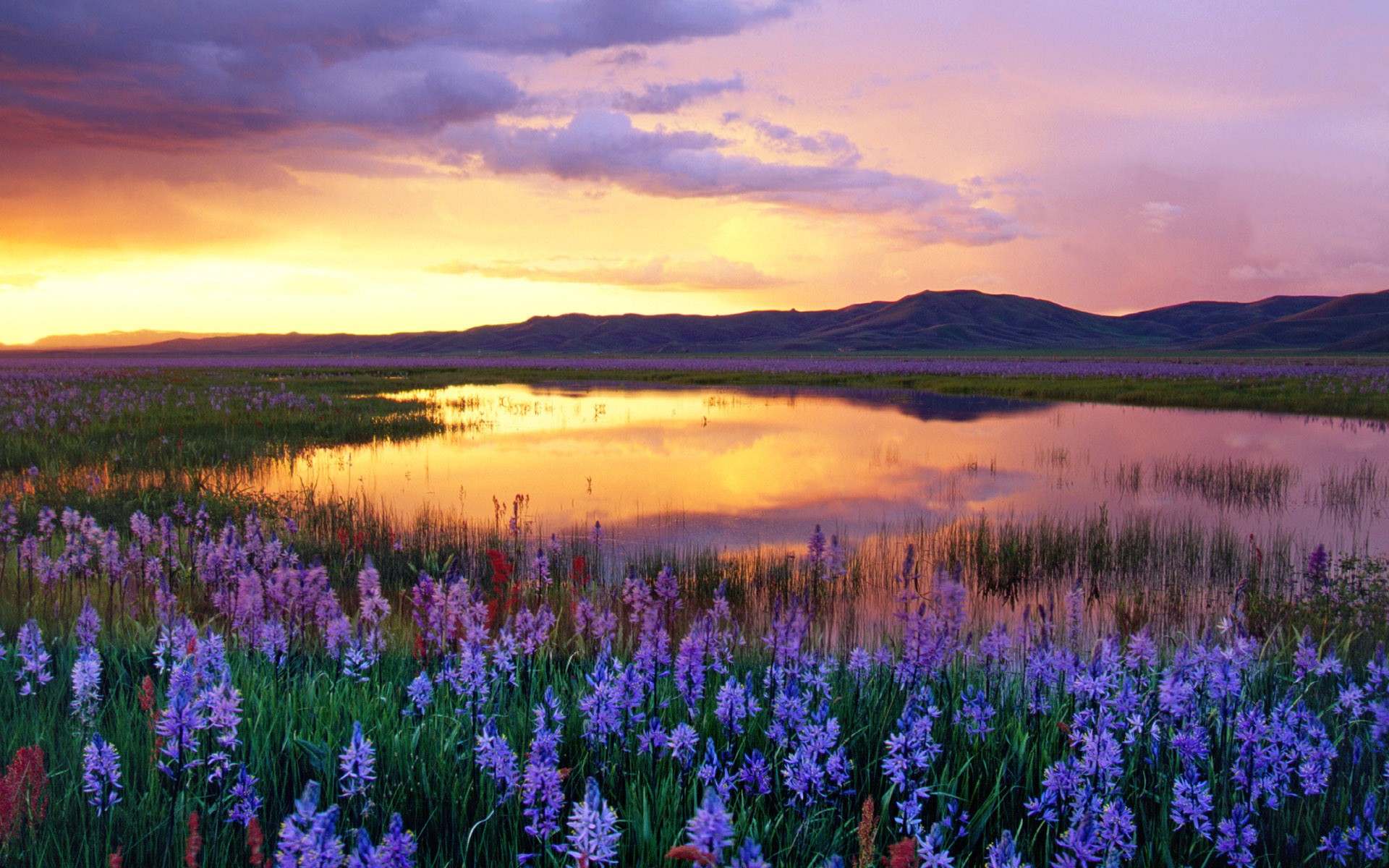 Fleurs bleues et plan d'eau avec le reflet du coucher du soleil