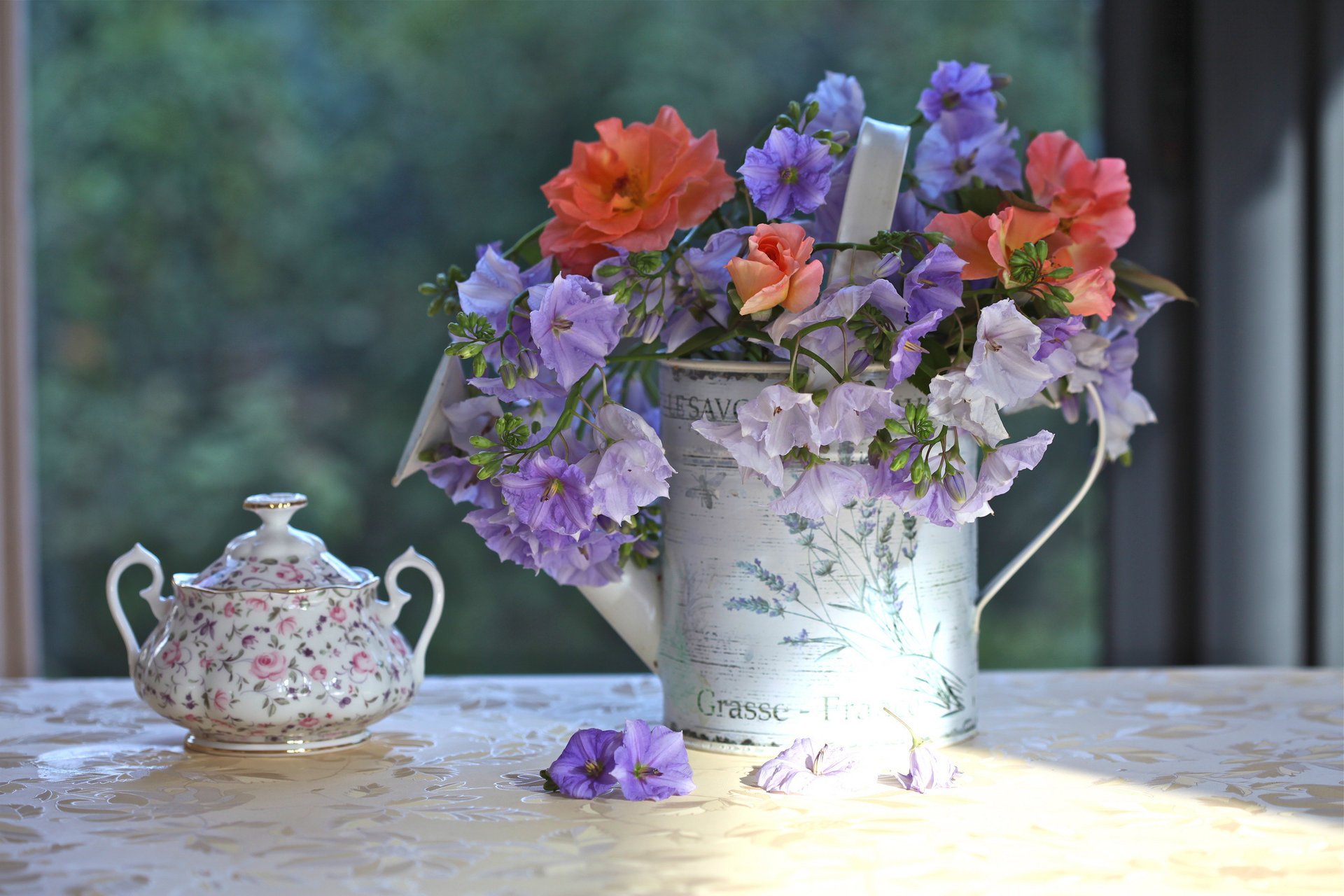 Bouquet de fleurs dans un pichet sur une clairièreBouquet de fleurs dans un pichet sur une clairière