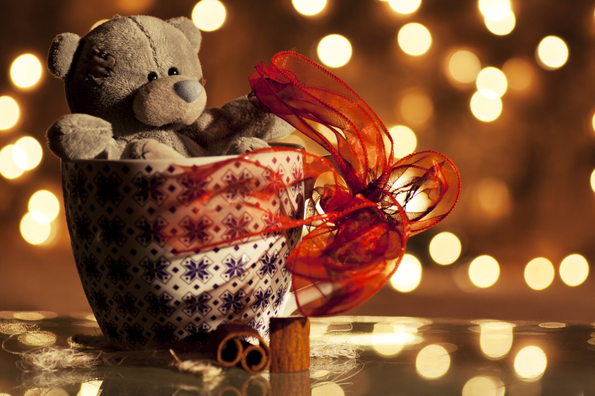 Ours en peluche emballé dans un pot avec un ruban cadeau rouge