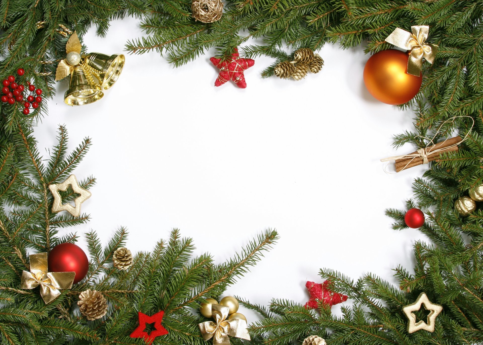 Cadre de noël avec branche de sapin et boules sur fond blancCadre de Noël avec branche de sapin et boules sur fond blanc