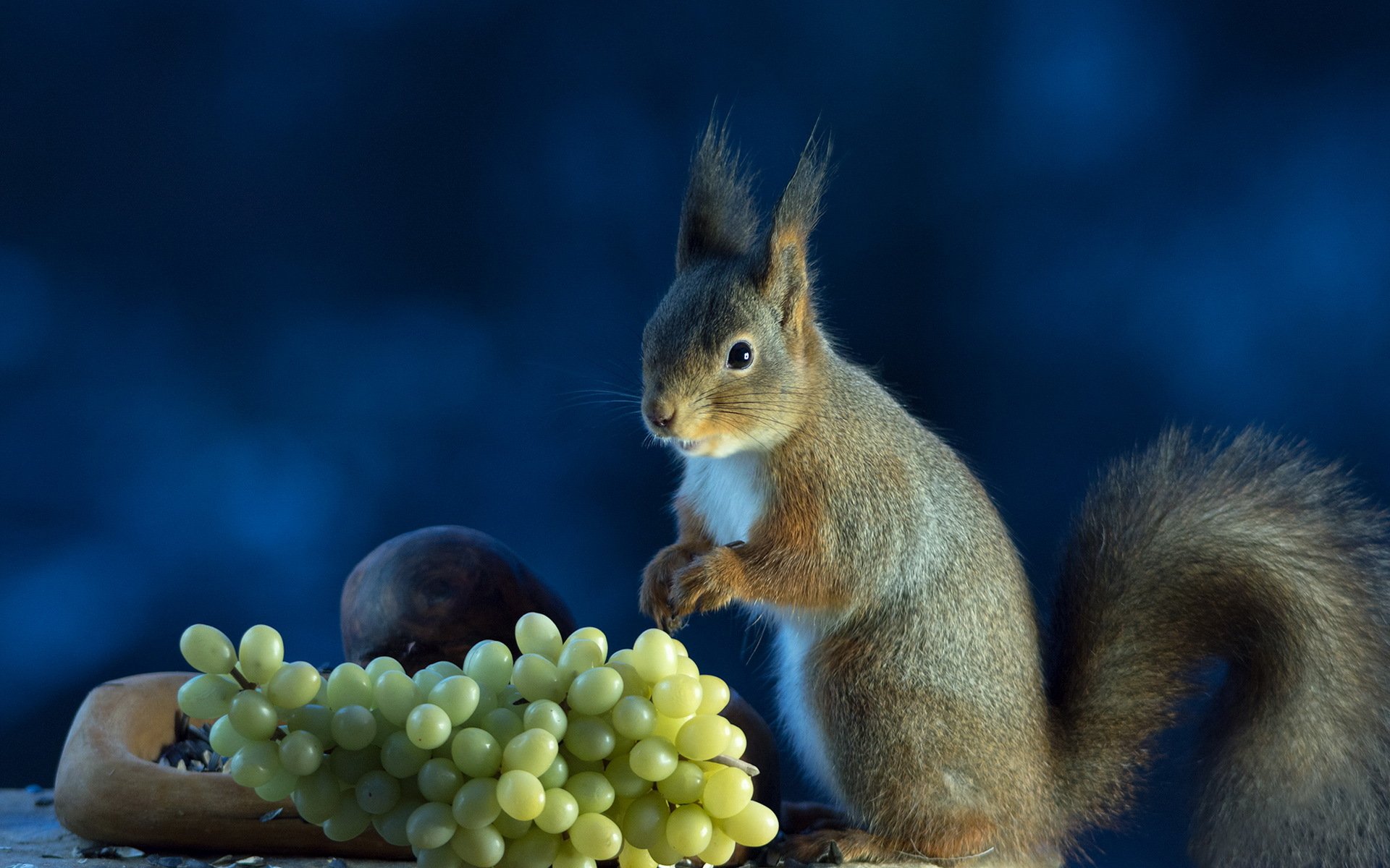 Écureuil gris se régale de raisins mûrs sur fond bleuÉcureuil gris se régale de raisins mûrs sur fond bleu